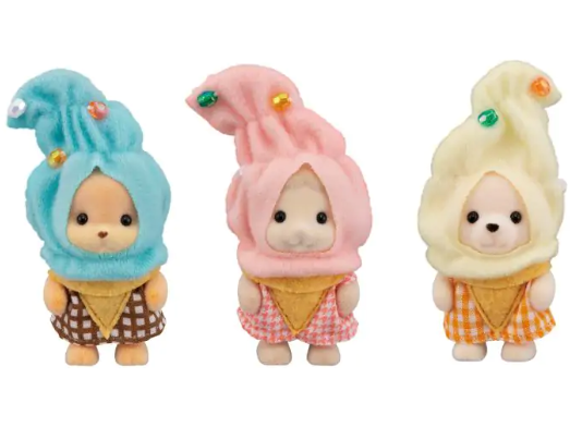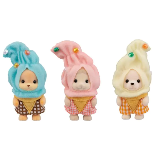 Caramel Dog baby, Sheep baby, and Polar Bear baby, all in ice-cream outfits (A total of 3 pieces) *A set of three baby figures with ice cream-themed outfits. *Includes ice cream-shaped hats. *The outfits are exclusive to this set. *Stimulates imaginative role-playing by children. *Suitable for ages three years and above.