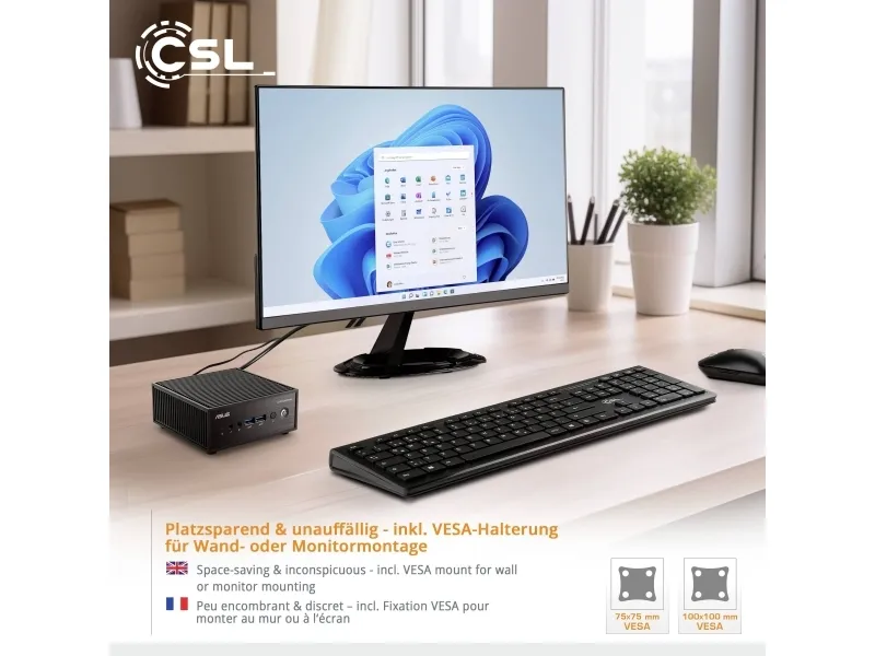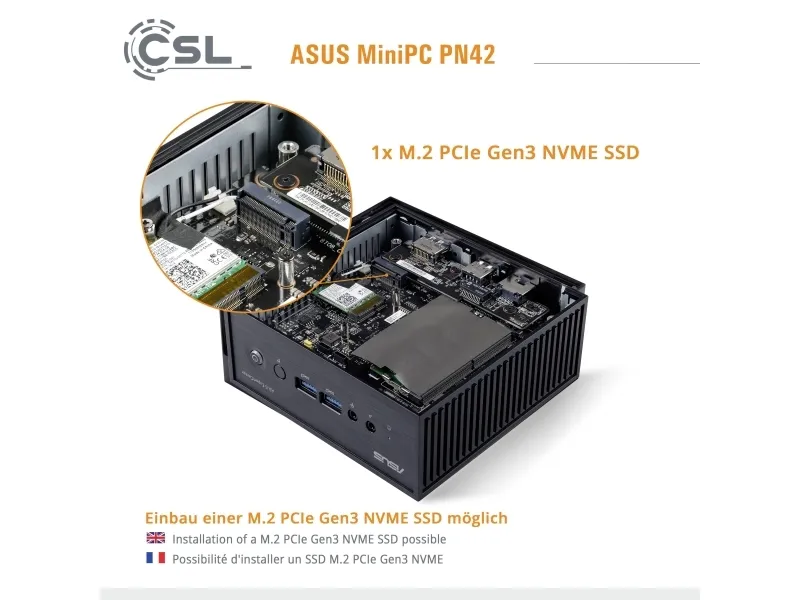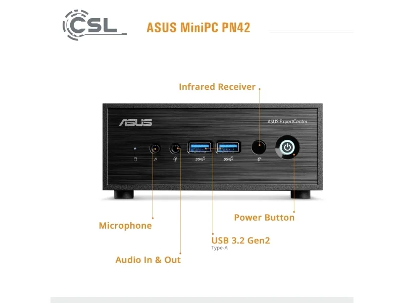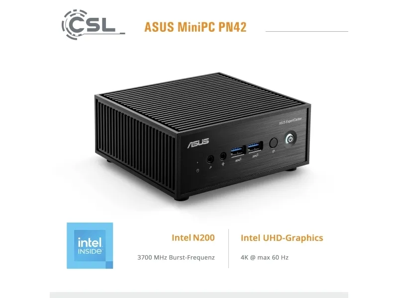 The ultracompact ASUS ExpertCenter PN42 mini PC is powered by an Intel® processor N100 & N200 with Intel UHD Graphics and is designed to easily handle a wide variety of home and business applications. ExpertCenter PN42 can support up to three displays, or two 4K displays, simultaneously for efficient multitasking. Plus, it can be specified with up to two 2.5 Gb Ethernet ports, and offers wide- ranging connectivity with up to seven USB ports plus an additional configurable port for either DisplayPortTM 1.4, VGA, COM, HDMI®, or USB-C® DisplayPort (DP Alt Mode) options. The diminutive size of ExpertCenter PN42 makes it well-suited for spaces where traditional PCs won't fit - from digital signage to small home-office setups.