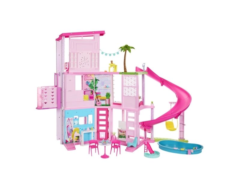 Kids can host the ultimate pool party with the Barbie Dreamhouse! This deluxe doll house has the tallest slide in the Barbie Dreamhouse series to date, with a three-story spiral design for endless fun in the sun. It inspires 360-degree play with a wide and spacious floorplan, three levels, and 10 indoor and outdoor living areas. The playset also features more pet-friendly touches than ever before, including a puppy slide and pool where furry friends can play along with Barbie doll! Plus, the top floor bonus room wows with a sleepover transformation that allows the Dreamhouse to sleep four dolls. With 75+ accessories and customizable spaces that double the fun, it makes an exceptional gift for kids ages 3 years old and up. Assembly required. Dolls not included. Colours and decorations may vary.Barbie Dreamhouse Adventures Dreamhouse, 75+ Pieces, Pool Party Doll House with 3 Story Slide. Recommended age (min): 3 yr(s), Sound effects. Batteries required. Assembly required