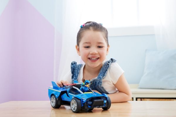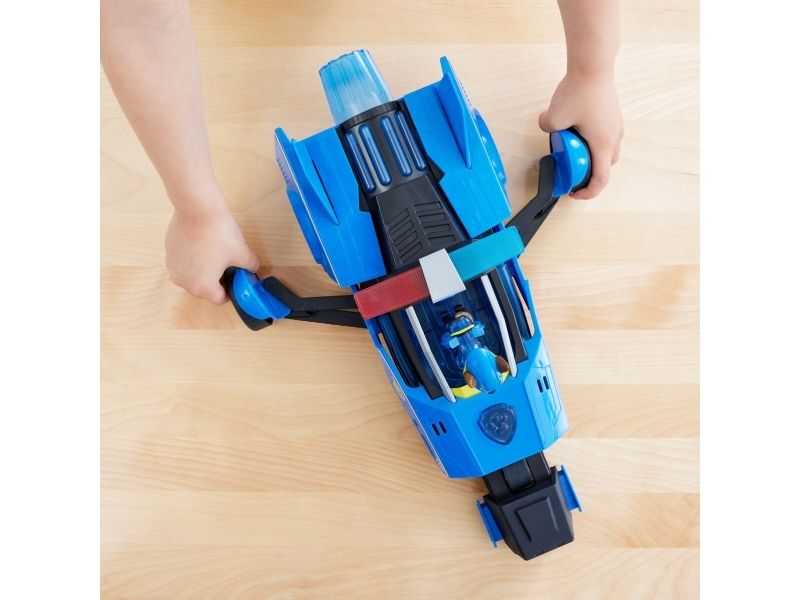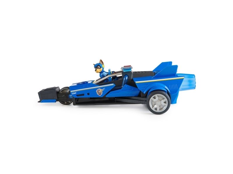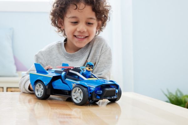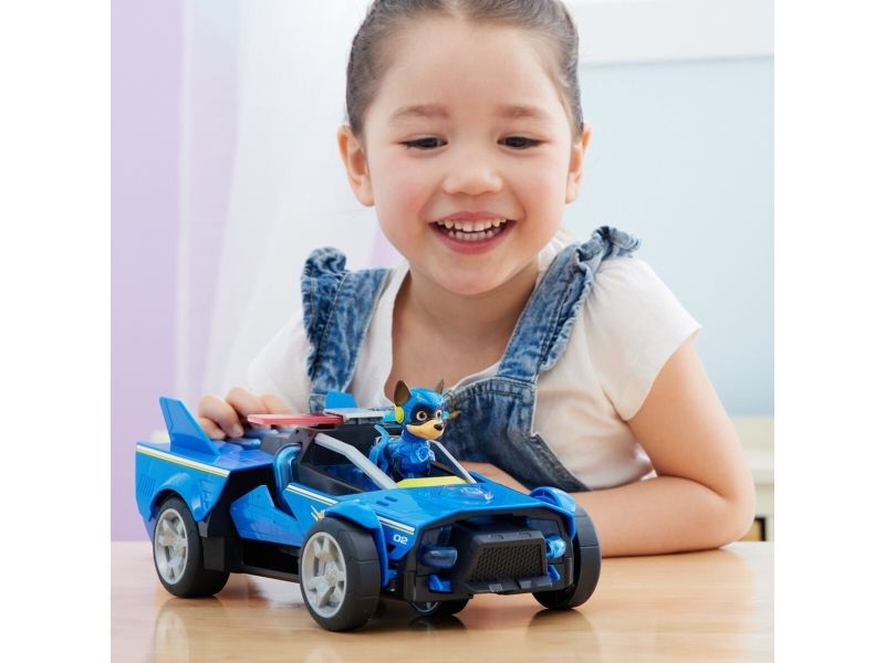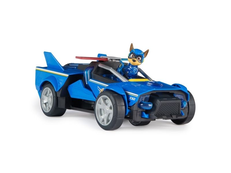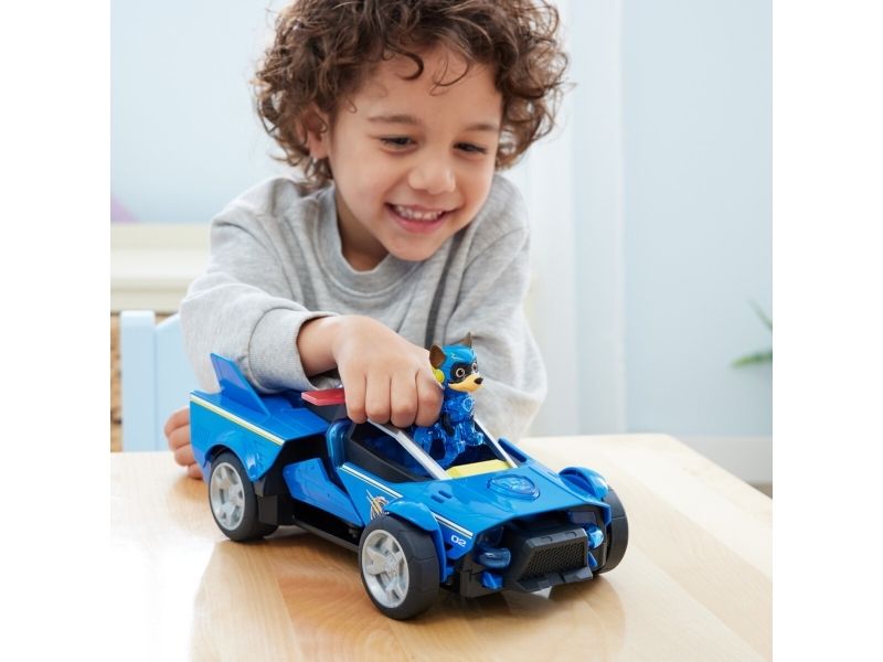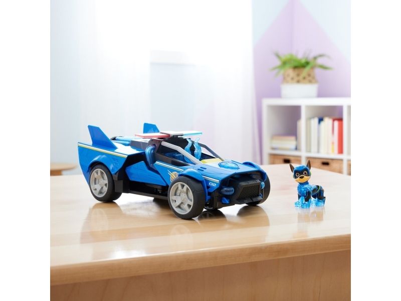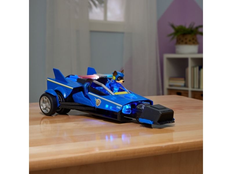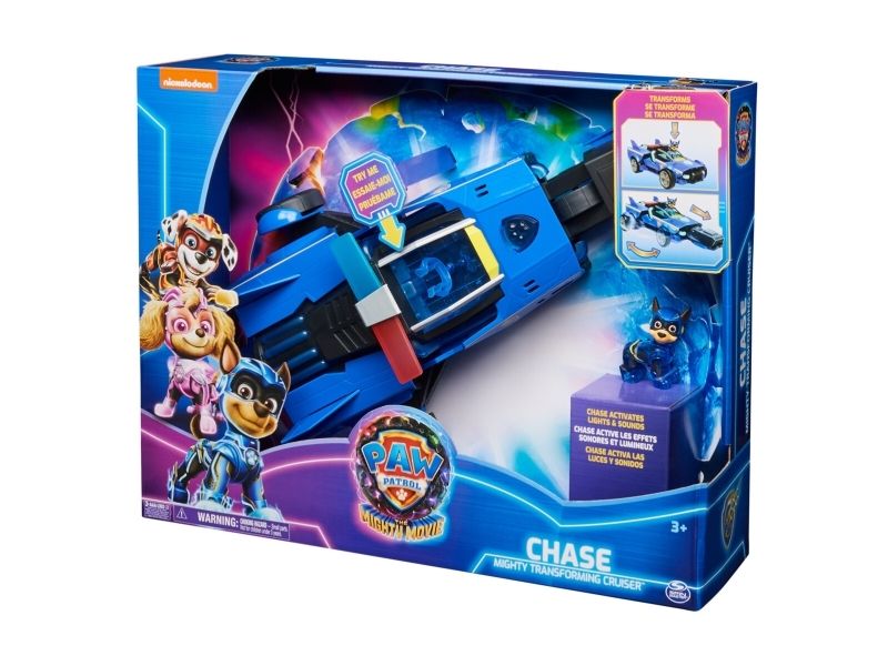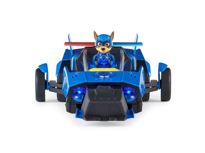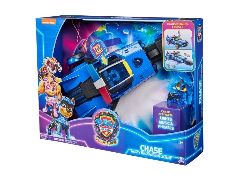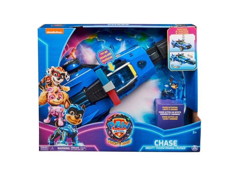 Team up with Chase and his PAW Patrol: The Mighty Movie rescue vehicle, for exciting rescue adventures right off the big screen! This PAW Patrol toy car measures over 12-inches long, 6-inches wide and stands 4-inches tall, with a super-sleek design, an awesome vehicle transformation and exciting sound effects and music, with synchronized flashing lights, that you see and hear in the movie! This deluxe police themed race car rescue vehicle would make a great gift for kids that are fans of the PAW Patrol Movie (Batteries Included)! Dressed in his blue PAW Patrol: The Mighty Movie uniform, with translucent sections and a cool helmet, clip your Chase action figure onto the seat of his police car toy to illuminate multiple areas on Chase and his vehicle, and watch his paws light up! Then, when it’s time for an action packed rescue mission, press down on Chase to activate his vehicle transformation, into rescue mode, which extends his vehicle to over 15-inches long and a whopping 8-inches wide, as you roll your toy car around from one mission to another! With PAW Patrol toys, a kid can explore his or her imagination and develop their motor skills through pretend play while reliving their favorite scenes from the movie! For even more fun and exciting PAW Patrol series-inspired missions, collect all the PAW Patrol movie toys, like the awesome Aircraft Carrier HQ and all the special edition PAW Patrol toys for girls and boys, like the Mighty Pups, Aqua Pups and Big Truck Pups toy figures and playsets (each sold separately) to enjoy endless PAWsome adventures with your favorite hero pup, in the Chase Mighty Transforming Cruiser!