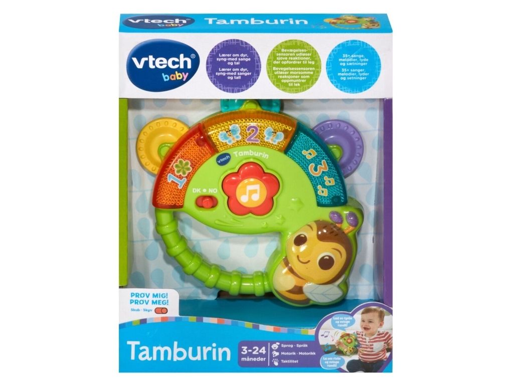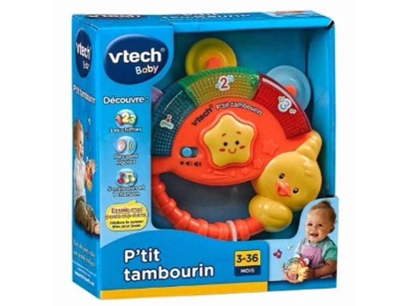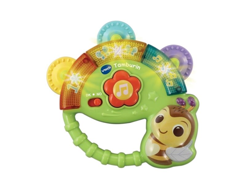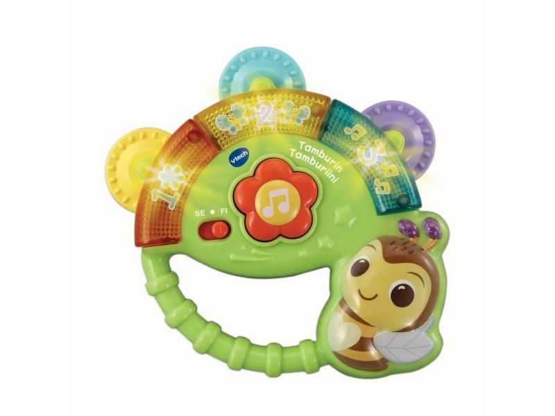 Baby will have a ball making music with the VTech Twinkle & Learn Tambourine. This educational toy features a special ducky friend as well as bright colors, ribbons and numbers. Your little one can have a fun time listening to the tambourine and happy sounds, as well as watching the flashing lights.