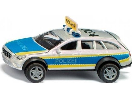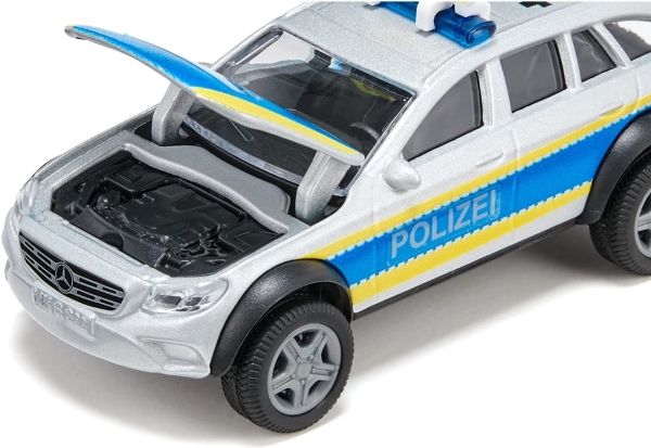 The all-terrain 4x4 police vehicle from siku is a real off-road specialist. No route is too rough, no terrain too unlevel, no deployment location too stony for it – the E Class service vehicle from Mercedes Benz with extreme off-road capability can make its way anywhere. The bonnet and rear flap can be opened, and an additional warning sign can be pushed onto the emergency light bar on the roof. In addition there is a sheet of fluorescent “Danger” stickers in various languages. Further “Police” stickers can be applied to the silver/blue sides of the vehicle, which has yellow signal markings, as well as to the bonnet. The E Class All Terrain police vehicle has a trailer coupling which is compatible with many siku trailers. Siku Mercedes-Benz E-Class All Terrain 4X4 Police. Product type: Police car model, Construction type: Preassembled, Scale: 1:50. Width: 104 mm, Depth: 44 mm, Height: 46 mm