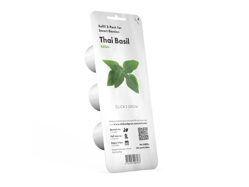 Invigorate your kitchen and tantalize your taste buds with the Click & Grow Smart Garden Refill 3-pack - Thai Basil. This essential kitchen companion allows you to grow fresh aromatic Thai Basil right where you need it quickly transforming your meals and home.Effortless Growth in Your HomeAbundant Health BenefitsPerfect kitchen-to-table experienceSmart Design for Lush GrowthAesthetic and EdibleEffortless Growth in Your Home Forget about the struggle of keeping herbs alive; Click & Grow makes growing Thai Basil simple and stress-free. Your indoor herb garden will flourish providing a constant supply of Thai Basil without the hassle of traditional gardening. With Click & Grow you only need to plant the seed pod and the smart garden takes care of the rest. Abundant Health Benefits Thai Basil is not just a culinary delight? it's also packed with vitamins and antioxidants that promote a healthy lifestyle. Adding fresh Thai Basil to your dishes is an effortless way to boost your nutrient intake while enjoying the flavours of your favourite recipes. Perfect kitchen-to-table experience With Click & Grow you'll enjoy the satisfaction of adding home-grown herbs directly into your meals. The aroma and taste of freshly picked Thai Basil will enhance your dishes giving you a garden-to-plate freshness that can't be beaten. Innovative Design for Lush Growth Our Smart Garden Refill 3-pack is designed to optimize Thai Basil growth so you can get the most out of every plant. The smart soil balances oxygen water and nutrients while the energy-efficient LED lighting ensures your Thai Basil receives the conditions it needs to thrive. Aesthetic and Edible Thai Basil isn't just for cooking; its rich purple stems and vibrant green leaves add beauty to any space. Whether placed on a windowsill or displayed in your Click & Grow Smart Garden this herb is a visual and culinary treat. Package includes3-pack Thai Basil seed pods for the Click & Grow Smart GardenProduct specificationsBiological name: Ocimum basilicumEdible plantSprouts in 7 - 14 daysHarvest in 5 - 12 weeksOptimal growth temperature: 18°C ? 30°C