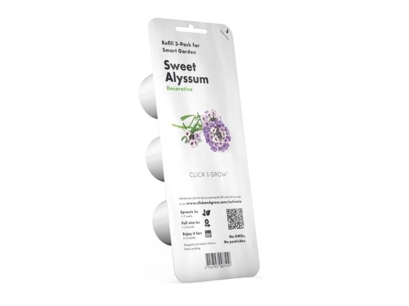 Elevate your indoor garden appeal with the sweet-smelling allure of Sweet Alyssum. The Click and Grow Smart Garden Refill embodies simplicity and elegance bringing a touch of nature's charm to your living space. Ensure continuous growth in your Smart Garden with this must-have refill pack.Effortless Planting: Insert the Plant Capsules in your Smart Garden and watch your flowers bloom.Aesthetic Enhancement: Sweet Alyssum's delicate blossoms add a sophisticated look to any interior.Natural Fragrance: Enjoy your home's subtle sweet aroma of fresh flowers.Hassle-free Gardening: No need for a green thumb as your Smart Garden takes care of your plants.Eco-friendly: Compatible with the Click and Grow Smart Garden system for sustainable plant nurturing.Effortless Planting The Click and Grow Smart Garden Refill makes planting as easy as a single click. Insert the Plant Capsules into your Smart Garden Starter kit and witness nature's magic unfold before your eyes. With no messy soil or potting required it's gardening simplified for modern living. Aesthetic Enhancement Sweet Alyssum is not only admired for its beauty but also for its ability to enhance the design of any space. Introduce the Grow Smart Garden Refill 3-pack to your home or office and create a visually stunning and welcoming environment. Natural Fragrance Invigorate your senses with Sweet Alyssum's naturally pleasant scent. As these lovely blooms grow in your Smart Garden they'll fill the room with their signature fragrance creating a relaxing atmosphere that complements any setting. Hassle-free Gardening Whether you're a seasoned gardener or new to planting Click and Grow's Smart Garden Refill ensures a no-fuss gardening experience. The integrated system automatically provides light water and nutrients to your Sweet Alyssum making plant care effortless and enjoyable. Eco-friendly In our commitment to the environment the Click and Grow Smart Garden and its refills are designed for sustainability. By incorporating this system into your home you're choosing an eco-conscious way to enjoy fresh beautiful flowers any time of the year. Package includes3 x Sweet Alyssum Plant CapsulesProduct specificationsPlant type: Sweet AlyssumCompatibility: Must be used with Click and Grow Smart Garden Starter KitPackage quantity: 3 capsules per packFragrance: Delicate sweet aromaGrowth preference: Indoor use