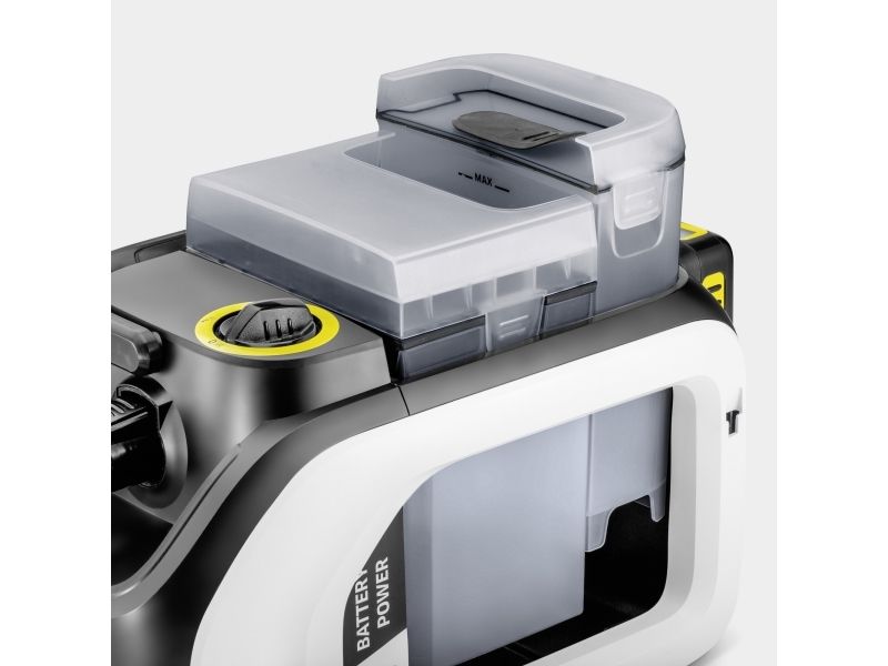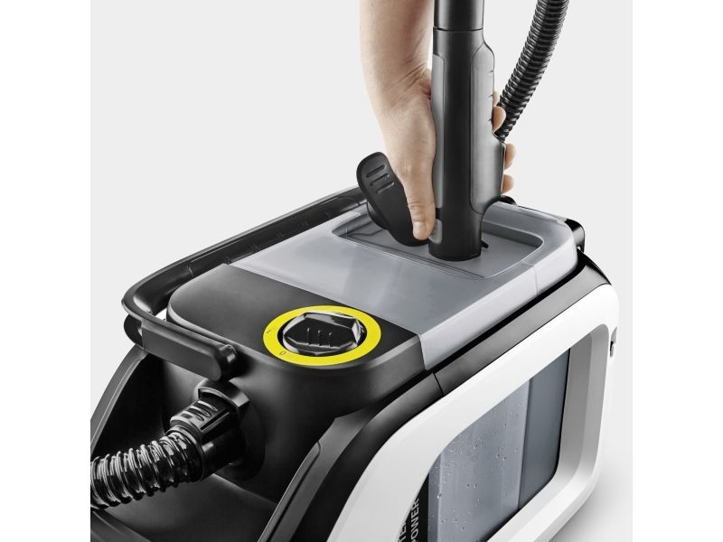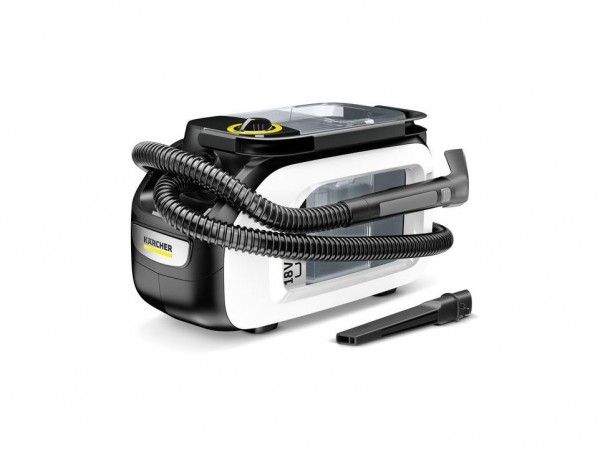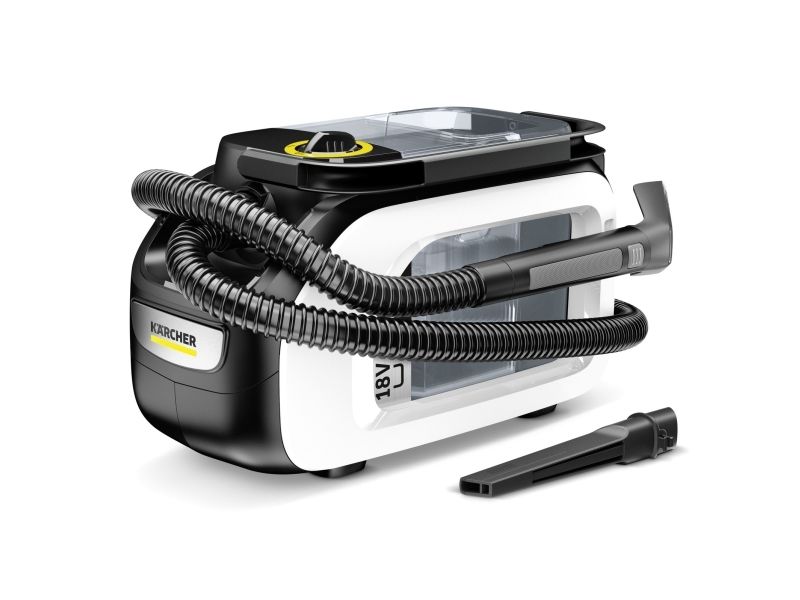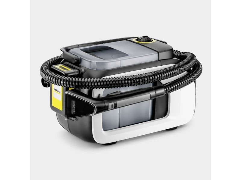 Deep cleaning meets maximum freedom of movement: the SE 3-18 Compact Home spray extraction cleaner gets textile surfaces clean down to the fibre, leaving no irritating residues and working just as effectively as a corded spray extraction cleaner. It takes the hard work out of a deep clean, enabling you to remove dirt from upholstery, mattresses and carpets in the house, garden furniture and the interior of your car or motorhome in no time at all. Thanks to the compact design, the device is not only easy to handle but can also be used when there's no power outlet nearby, thanks to the 18 V Kärcher Battery Power battery (not included in the scope of supply). The long and flexible suction hose with built-in detergent hose also guarantees great convenience and flexibility, even in hard-to-reach spaces. It takes clean tools to deliver clean results: with the help of its hygienic system cleaning function, the spray extraction cleaner also removes any dirt and bacteria in the device itself, preventing unpleasant odours. True to the motto "clean vehicle, clean cleaning device".Kärcher SE 3-18. Maximum input power: 184 W. Type: Drum vacuum, Cleaning type: Wet, Dust container type: Bagless. Noise level: 70 dB. Product colour: Black, Grey, White