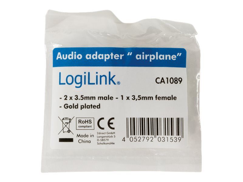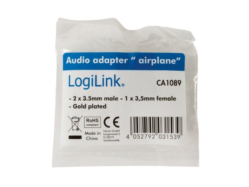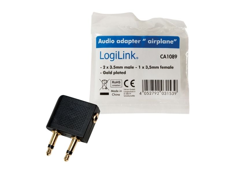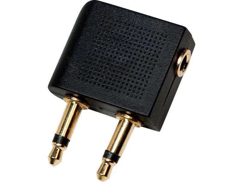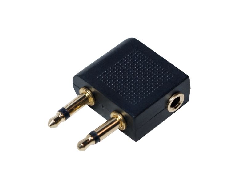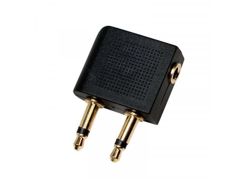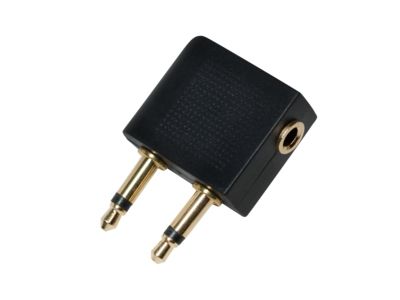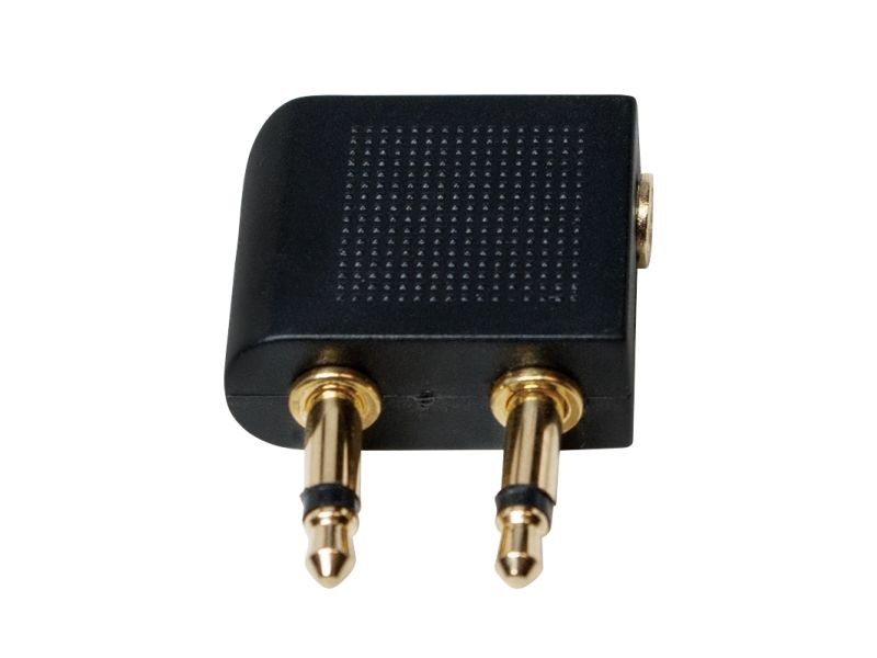 - Converts a regular headphone plug 3.5 mm to a dual 3.5 mm airline plug - Input: 2x 3,5 mm plug - Output: 1x 3,5 mm jack - Gold plated - Fits to all standard airline connectors and headphone stereo jacks