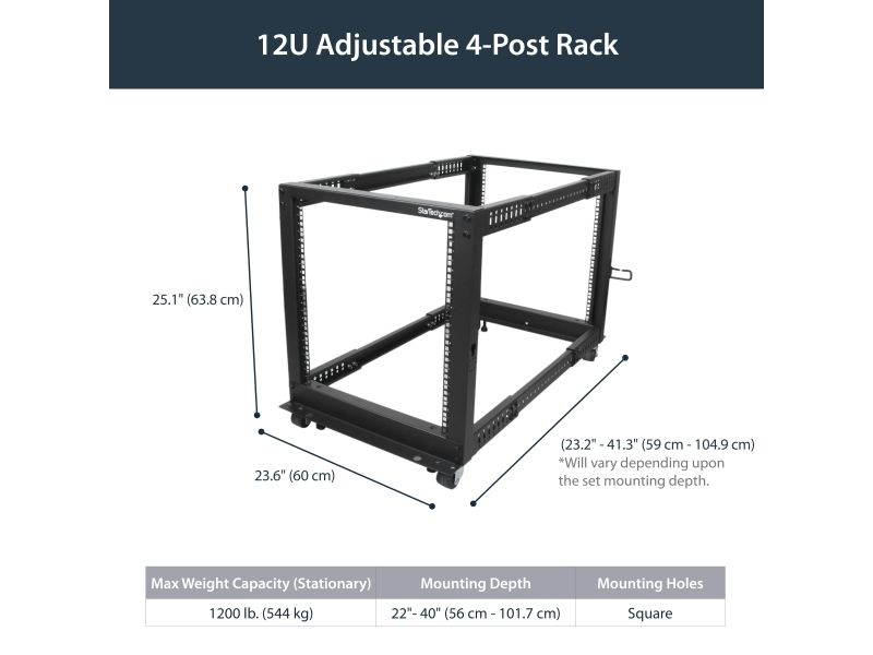 Designed with ease of use in mind, this 12U rack offers easy-to-read markings for both rack units (U) and depth, with a wide range of mounting depth adjustments (22 - 40in) that make it easy to adapt the rack to fit your equipment.