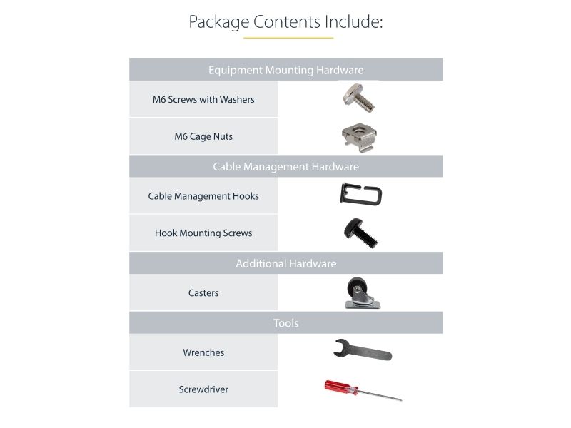 For a complete server storage solution that saves you time and hassle, the rack includes optional accessories such as casters, leveling feet and cable management hooks. The base is also pre-drilled for securely fastening the rack to the floor if needed, providing you with additional stability to better suit your server environment.