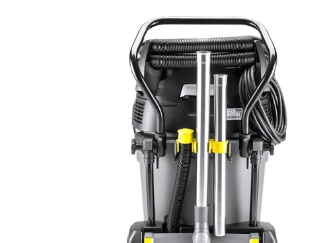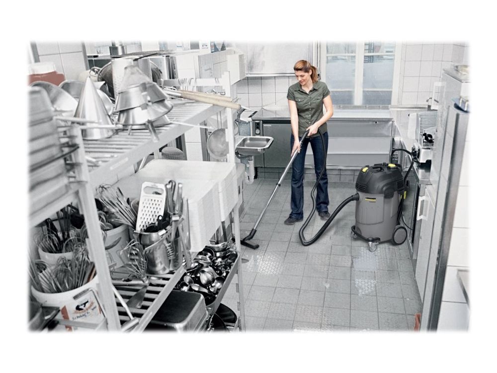 The NT 65/2 Ap is a powerful wet and dry vac with the ApClean system, which ensures constant high suction power and long working intervals. The vacuum features a compact turbine housing with integrated filter cover for easily removing the large flat pleated filter. It is effectively cleaned with the help of the semi-automatic ApClean filter cleaning system. This ensures constant high suction power, longer working intervals and a long service life of the filter. The NT 65/2 Ap features electronic fill level detection for wet vacuuming. It prevents the maximum permitted fill level from being exceeded. The problem-free disposal of vacuumed fluids is made possible by the attached oil-resistant drain hose. Accessories can be quickly and easily connected to the vacuum using the clip system . The unit features a hose storage device, an accessory holder and a large tray e.g. for tools. The required mobility of the NT 65/2 Ap is provided by two large fixed wheels and two guide rolls.