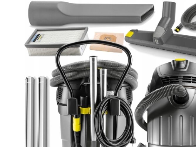 - Suction hose, 4 m - Suction tube, metal 2 x 0.5 m - Filter bag, Paper - Wet and dry floor nozzle, 360 mm - Crevice nozzle - Drain hose (oil-resistant) - Automatic switch-off at max. filling quantity - Flat pleated filter, Paper - Bend - Filter cleaning, ApClean (semi-automatic filter cleaning system) - Sturdy bumper - Push handle - Protection class, I - Steering roller stop - Maintenance-free suction turbines, 2 piece(s)