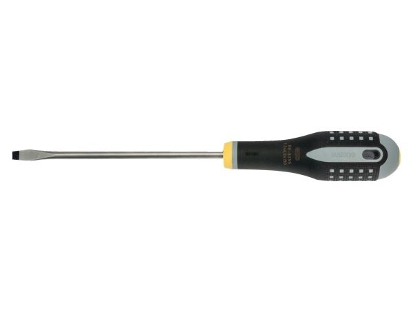 Schraubendreher Ergo, Ausklinkung, 1,2X6,5X150mm, 272mmSchraubendreher entwickelt nach dem ergo™-Verfahren. Für gerade Ausklinkung. Griff: 3-Komponenten-Griff für maximalen Komfort und Kraftübertragung. Die richtige Klinge ist durch die Farbmarkierung und das Symbol am Griffende leicht zu erkennen. Klinge: Hochleistungsstahllegierung, verchromt und durchgehärtet. Brünierte Spitze für höhere Genauigkeit. ISO 2380/DIN 5264.