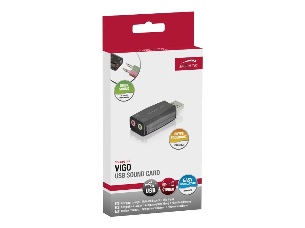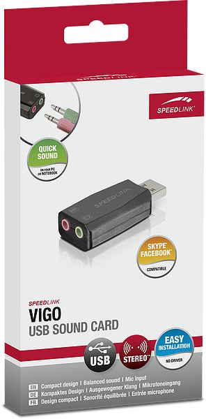 Listen to music, enjoy your game's sound effects, make calls via the internet - and do that anywhere. The VIGO USB sound card upgrades any PC or notebook with a powerful audio solution which produces balanced stereo sound plus allows you to connect a headset thanks to its microphone input socket. The sound card doesn't need any additional drivers, making it quick and easy to install. On top of that, the compact casing makes it ideal for mobile use with your notebook.