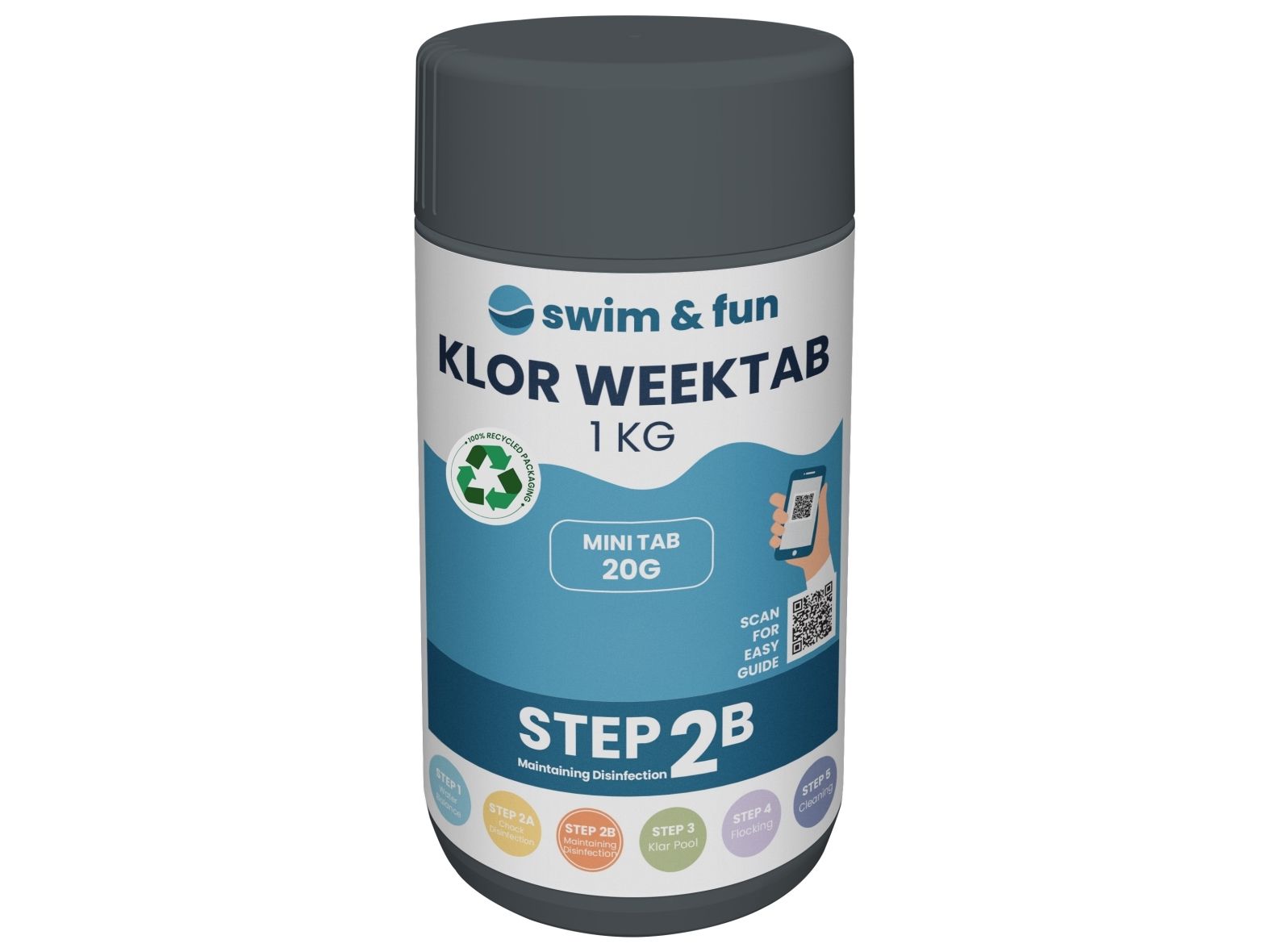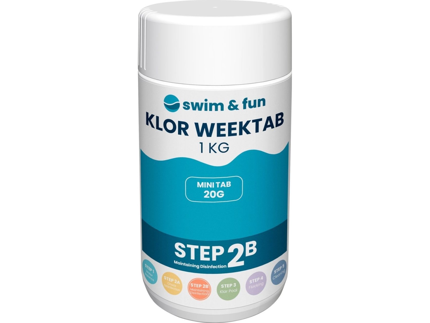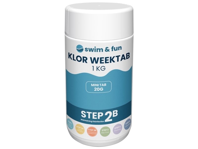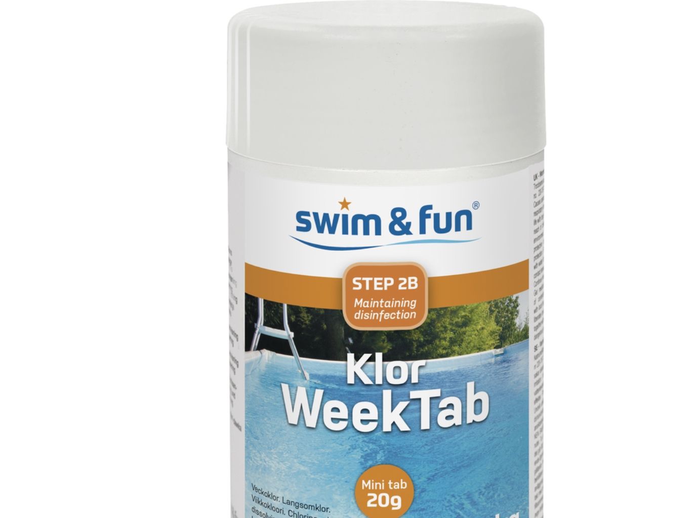 Die langsamlöslichen Chlortabletten WeekTab werden zur Aufrechterhaltung eines geeigneten Chlorgehalts im Wasser verwendet, sodass das Wasser immer sauber und frisch bleibt. Die Tabletten enthalten einen Stabilisator, der dem Abbau durch UV-Strahlen der Sonne entgegenwirkt. Je nach Aktivität und Wetterbedingungen fügen Sie etwa einmal pro Woche neue Tabletten hinzu.