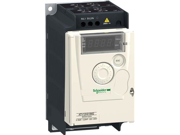Frekvensomformeren ATV12, 0,37kW, 0,55 HP, 200-240 V, 1-fa., m. Kølelegeme- Antal digitale indgange: 4 - Digital indgang: programmerbar LI1...LI4 24 V 18...30 V - Antal analoge udgange 1 - Antal logik udgange 2 - Digital udgang: logik-udgang LO+, LO- AC15 beskyttet relæudgang R1A, R1B, R1C 1o/1SFrekvensomformer 0,18 -4 kW - meget kompakte mål - integreret EMC -filter klasse B (første miljø, generelle tilgængelighed:) - motorstyring både via den klassiske U/f-karakteristik, som også via sensorløse vektor regulering eller pumper -/blæser karakteristik - fejlstrømsafbryder kan konfigureres, endda i emballage - beskyttelse lakeret printkort til de sværeste omgivelsesbetingelser - Plug and Drive - en standard applikationen kører uden indstillinger - intuitiv betjening - Modbus integreret