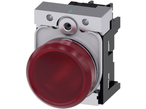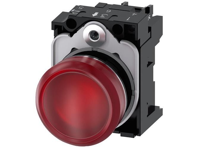 Indicator light, 22 mm, round, metal, high gloss, red, lens, smooth, 24 V AC/DC Indicator lights, 22 mm, round, metal, shiny, red, lens, smooth, with holder, LED module with integrated LED 24 V AC/DC, screw terminal Indicator lights SIRIUS ACT for signaling switching states or faults in systems with high luminosity, thanks to energy-efficient LED technology. Under the brand name SIRIUS ACT, Siemens offers a unique portfolio of pushbuttons and signaling devices with global product approvals in four modern design lines of rugged genuine metal and high-grade plastic. An innovative snap-on concept makes the task of installing a unit so easy that it can be done with one hand and without any special tools. Groove-free holes are adequate as mounting holes since full twist prevention is already integrated. Thanks to the high degree of protection throughout, the rugged devices are suitable for use in industry and outdoors. Even cleaning with a high-pressure jet is possible. Neither dust, oils, nor caustic solutions can interfere with reliable operation. As well as standard wiring, the devices can also be connected to the controller via PROFINET, AS-Interface or IO-Link. Doing so will help you to reduce wiring time and effort, minimize error sources and have more flexibility. The graphical Online Configurator provides convenient support when selecting and ordering individual devices, enclosures and labels. Extensive documentation (e.g. manual, 3D data, terminal diagram) is available. Versions available: Several colors, different voltage variants. Note: Complete unit, delivery includes holders and modules. SIRIUS ACT - Performance in action for control and signalling. Simply mounted, simply strong, simply perfect.