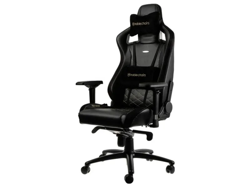 Der noblechairs EPIC Gaming-Stuhl in Schwarz-Gold ist wie alle „Faux Leather“-noblechairs ein archetypischer Gaming-Luxussessel mit 100% veganem PU-Kunstlederbezug höchster Güteklasse. Bei diesem royalen Exemplar erstrahlt der komplette Gaming-Stuhl in vornehmem Schwarz mit goldenen Akzenten. Für eine ideale Atmungsaktivität ist das Material über den gesamten Sitz- und Kontaktbereich fein perforiert und zudem im Lendenbereich sowie auf der Sitzfläche mit einem Diamantmuster bestickt, dessen filigrane Erhebungen Lufträume erzeugen und so zusätzlich zur optimalen Belüftung beitragen – auch im Hochsommer. An den Seitenflächen des Gaming-Stuhls wird das Lederimitat von schwarzen Streifen aus rauem Kunstveloursleder attraktiv umrahmt, deren Haptik echtem Wildleder nachempfunden ist.
