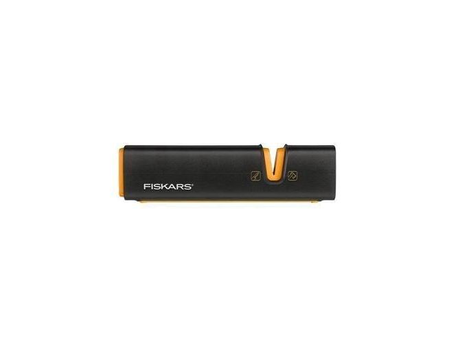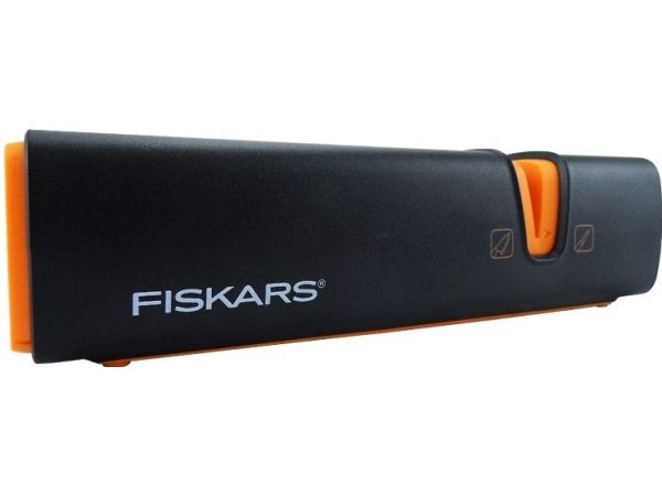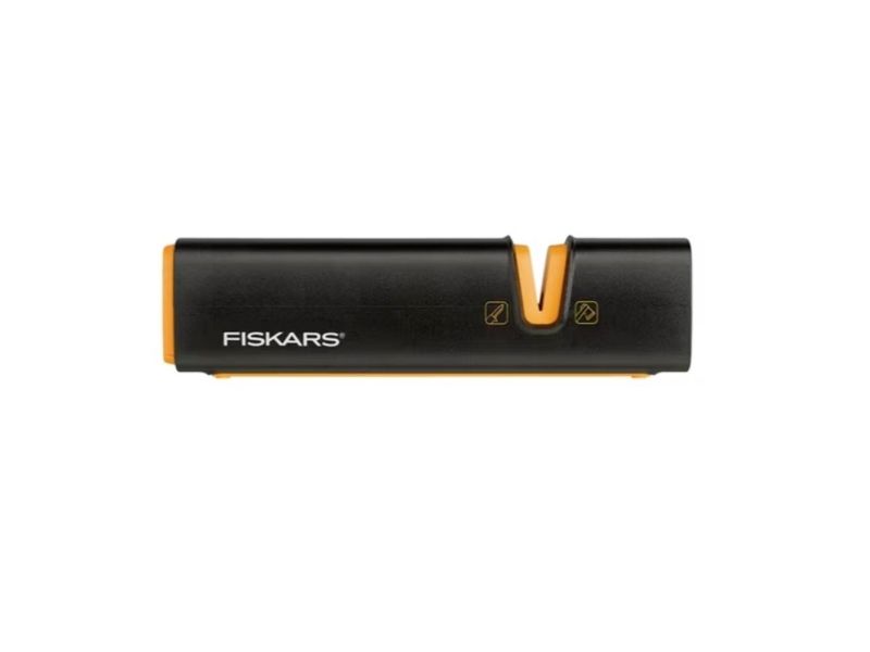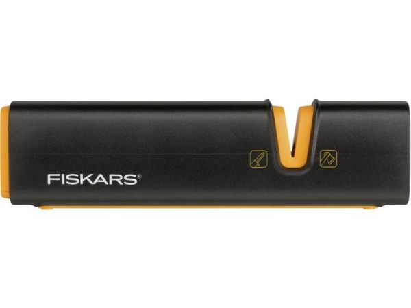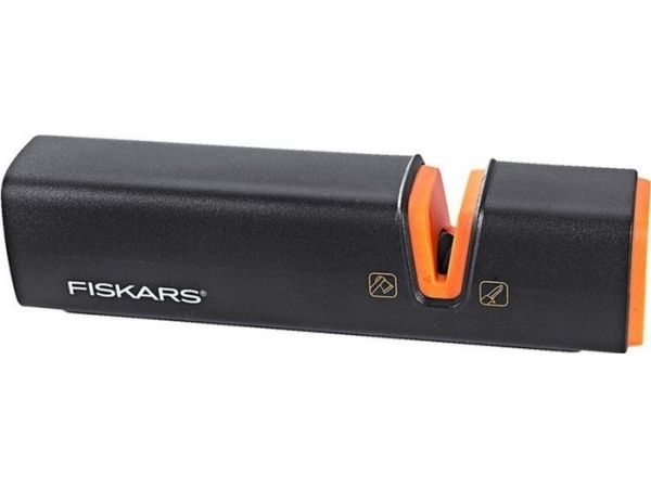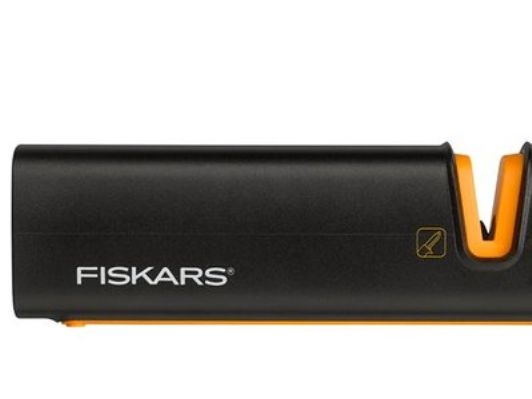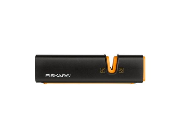 Sollte die Schneidqualität Ihrer Axt beziehungsweise Ihres Messers einmal nachlassen, ist der Griff zum Fiskars Axt- und Messerschärfer das Richtige! Mit dessen Hilfe können die Geräte leicht und sicher nachgeschärft werden. Je nachdem, ob ein Messer oder eine Axt geschärft werden soll, gibt es unterschiedliche Einstellungen. Für Äxte kann die Führung breiter eingestellt werden als für Messer. Das Gerät besitzt einen langlebigen Schleifkopf aus Spezialkeramik, der darüber hinaus über eine automatische Klingenführung verfügt. Das Gehäuse des Fiskars Axt- und Messerschärfers besteht aus leichtem aber stabilem, glasfaserverstärktem Kunststoff. Durch die speziellen Antirutsch-Auflagepunkte an seiner Unterseite findet es einen stabilen Halt während der Benutzung. Das Werkzeug ist sowohl für Links- als auch für Rechtshänder geeignet. Es wiegt gerade mal 90 Gramm und hat eine Breite von 16,5 Zentimetern. Das typische Fiskars Design fehlt auch bei diesem Werkzeug nicht - auch hier dominiert das Schwarz und wird durch kleine, orangefarbene Elemente ergänzt.