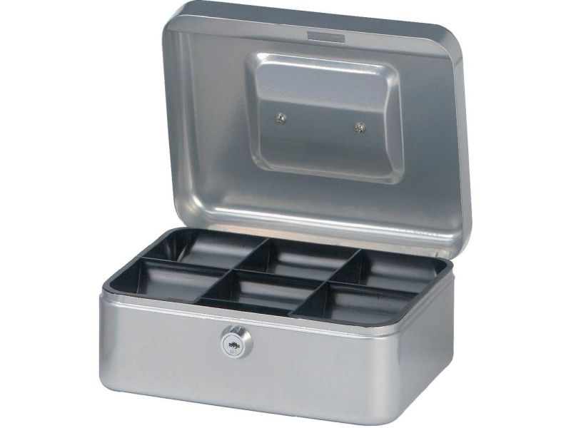 Spardose, 20 cmAus lackiertem Stahl, vollständig gepresst, verzinkter Griff, Sicherheitszylinderschloss mit 2 Schlüsseln, Münzeinsatz aus Kunststoff.