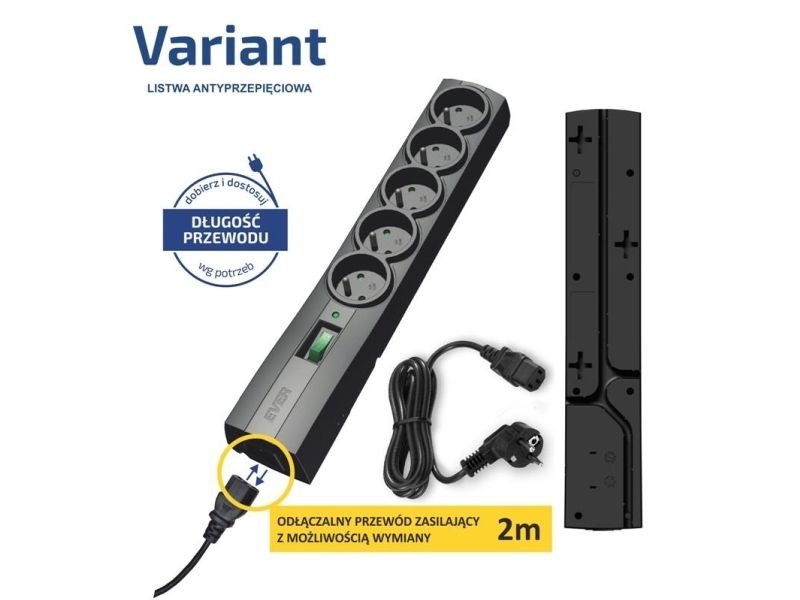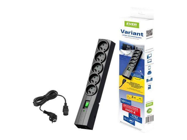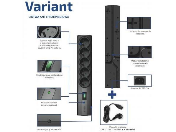 The Variant surge protector provides effective protection to the connected household or office devices against surges in the mains. The protector is dedicated for devices, such as desktop PCs and notebooks, peripherals, audio/video and multimedia devices. The protector features five grounded mains sockets with child protection system, preventing children from tampering with live elements. The protector's other functions combine an LED indicating, whether the surge protection is active, an automatic fuse for quick and easy reactivation of the protector and an illuminated, two-pole switch.