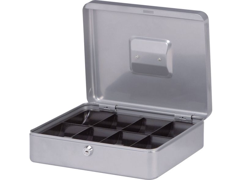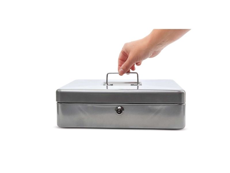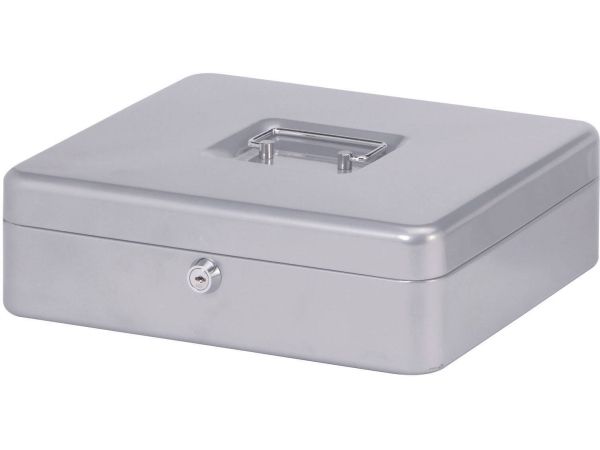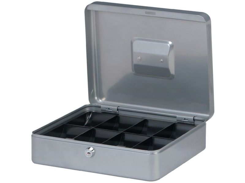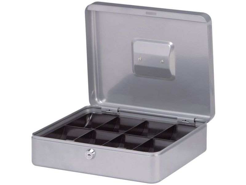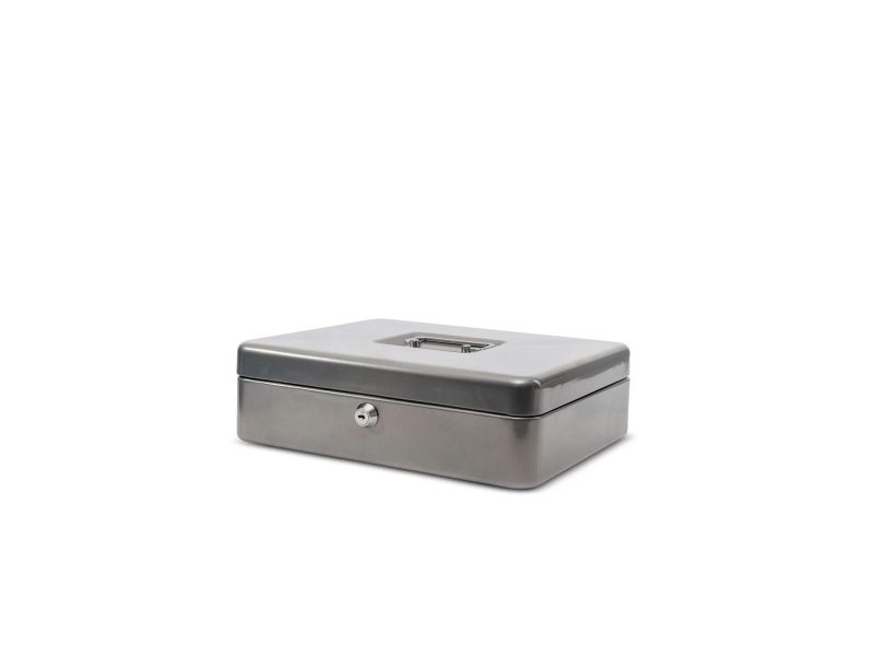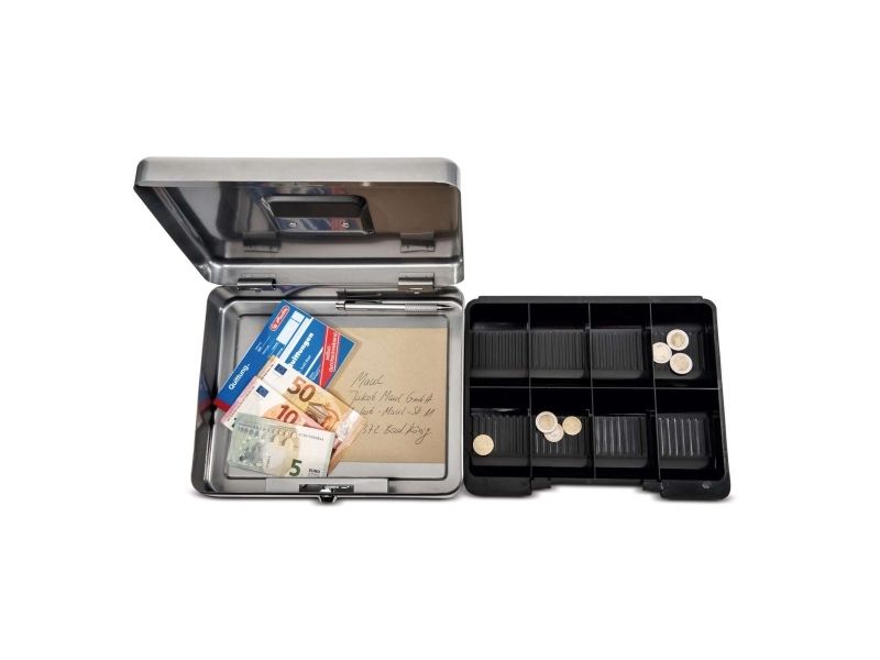 Spardose, 30 cmAus lackiertem Stahl, voll gepresst, verzinkter Griff, Sicherheitszylinderschloss mit 2 Schlüsseln, Münzeinsatz aus Kunststoff.