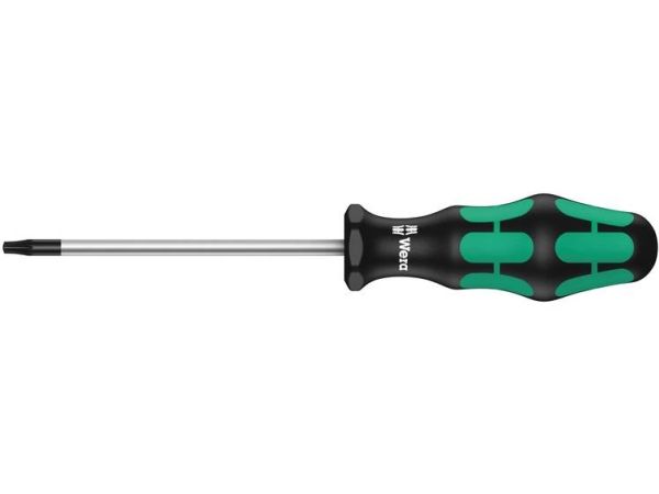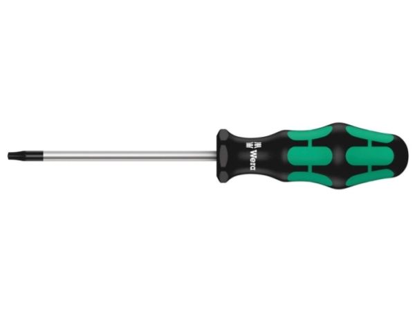 High quality Kraftform Plus screwdriver by Wera. TORX PLUS® profile: in comparison to "normal" TORX® profiles, the enlargement of the 6 torque-transferring flanks between the tool and screw is implemented by using an elliptical and not circular profile design. This means that the power applied when fastening is spread across a larger surface area. Higher torque is transferred and the service life of the screw and tool is also enhanced. Multi-component Kraftform handle for rapid and convenient working. Kraftform Plus: hard gripping zones for high working speeds whereas soft zones ensure high torque transfer. The Wera Black Point tip offers a perfect fit and optimised corrosion protection. The hexagonal non-roll feature prevents any annoying rolling away at the workplace. Handle markings for simplified finding and sorting of the tools.