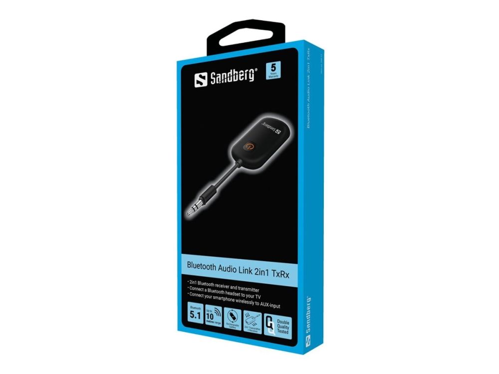 Sandberg Bluetooth Audio Link 2in1 TxRx enables you to send and receive a sound signal wirelessly via Bluetooth. Configured as a sender (Tx) you can get the sound signal from a headset output in for instance your TV connected to your Bluetooth headset. Configured as a receiver (Rx) you can connect a Bluetooth device like a mobile phone through the AUX port on for instance your car stereo to enjoy wireless music from your mobile through the sound system of the car.