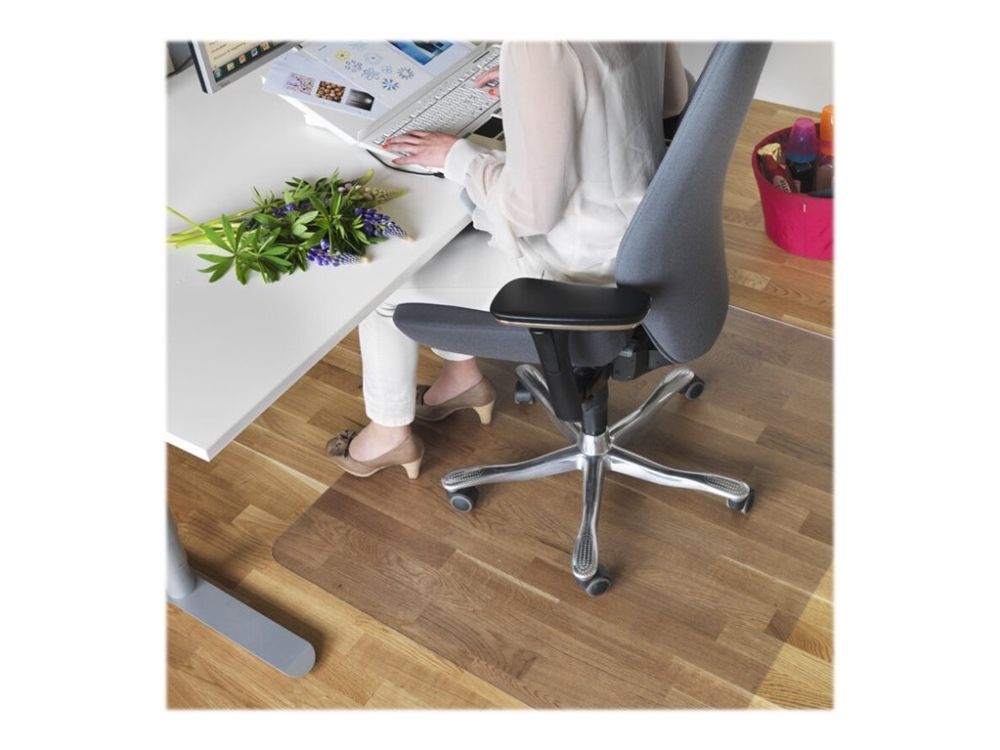 Stuhlpolster für harte Böden, ohne Spikes. Eine Stuhlmatte schützt Böden und Teppiche vor Abnutzung und Schmutz. Am häufigsten wird er am Arbeitsplatz verwendet, um den Boden vor den Rollen von Bürostühlen zu schützen, aber oft ist der Boden auch an vielen anderen Stellen Verschleiß oder Nässe ausgesetzt. Eine Stuhlmatte in der richtigen Größe passt auch unter das Handdesinfektionsmittel, in den Flur, unter den Blumentopf, neben die Kaffee- oder Wassermaschine, den Drucker oder überall dort, wo der Boden geschützt werden muss. Eine Stuhlmatte ohne Spikes ist für harte Böden, harte Teppiche und sehr kurzflorige Teppiche geeignet.Umweltfreundliche Stuhlmatte aus starkem PET-Kunststoff - enthält Kunststoff aus bis zu 60 recycelten Plastikflaschen.Rutschfeste Unterseite.