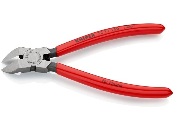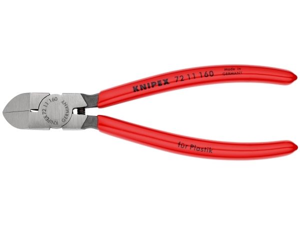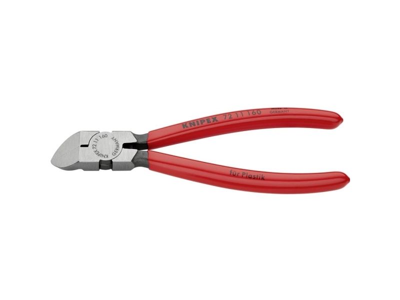 72 11 160 Schrägschneider für Kunststoffe Mit flachen Schneiden. Zum flachen Schneiden von Kunststoff-Spritzgussteilen und Formresten. Schneidet Material wie Blei leicht und ohne Grat. Mit Öffnungsfeder. 45° gebogene Schneiden