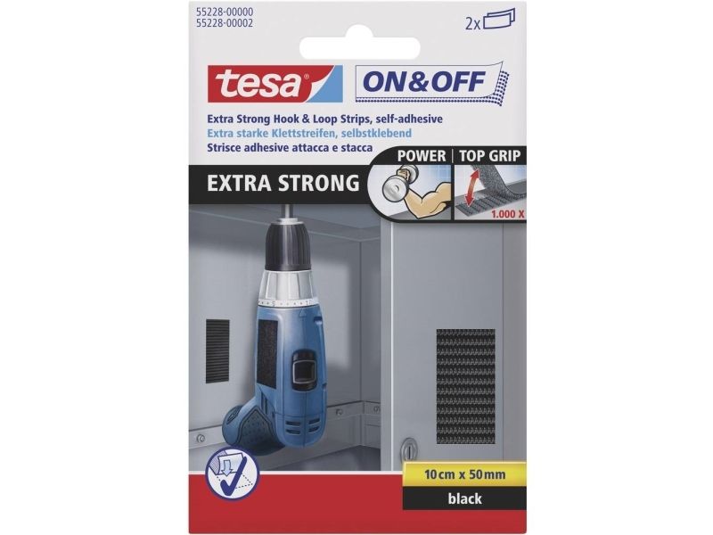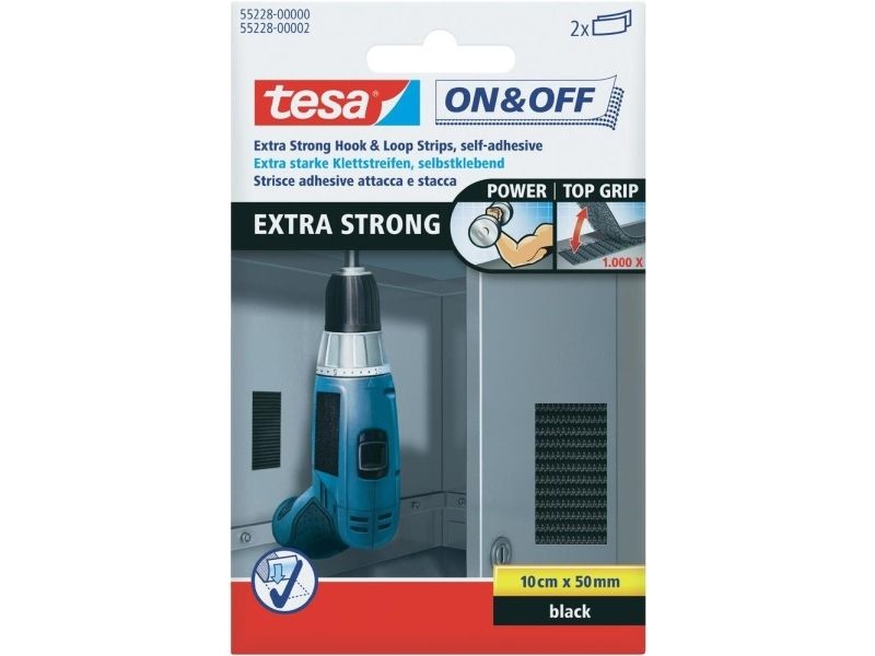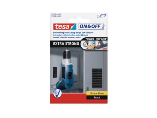 Die extrastarken tesa® On & Off Klettstreifen vereinen die überlegene tesa®-Klebetechnologie mit einem innovativen Klett-System und sorgen so für eine beeindruckende Halteleistung. Die Klebmasse wird verwendet, um die verschiedenen Klettstreifen (Hakenseite und Flauschseite) auf der jeweiligen Oberfläche zu fixieren. Die Klettverbindung erzeugt dann einen sicheren Halt für das Objekt, wobei die besondere Form der Haken eine wichtige Rolle spielt.