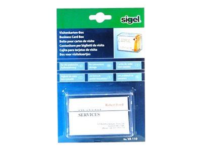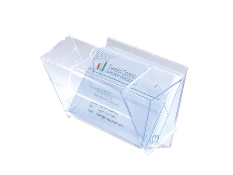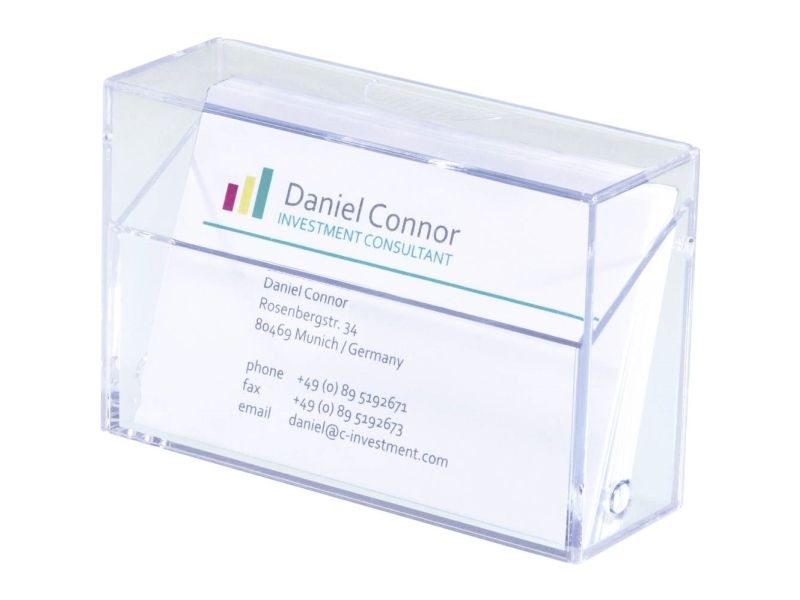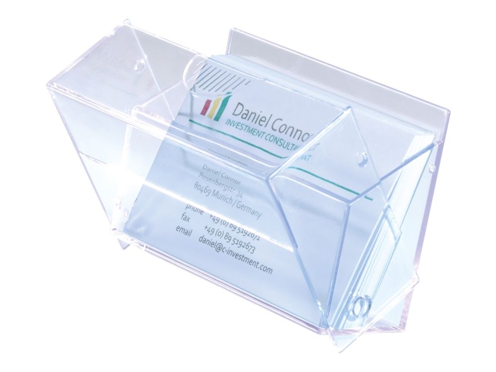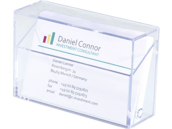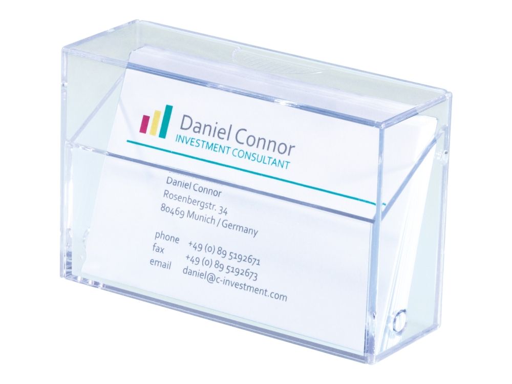 Glasklare Visitenkarten-Box aus Hartplastik mit praktischer Doppelfunktion: Im geschlossenen Zustand dient sie als sichere Aufbewahrungsbox und aufgeklappt als Aufsteller zur Präsentation der Visitenkarten. In die Box passen bis zu 100 Visitenkarten (max. 86 x 56 mm). Die Außenmaße betragen 100 x 70 x 10 mm (B x H x T).