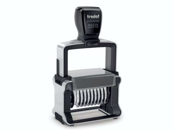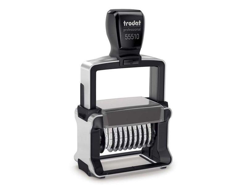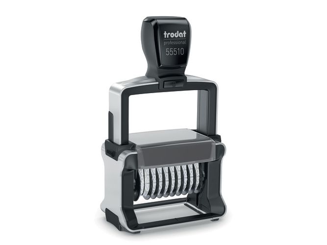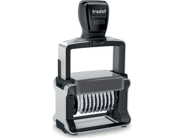 Self-inking numberer with 10 digitsTrodat 55510. Product type: Self-Inking, Type: Number stamp, Stamp material: Steel. Weight: 230 g. Quantity per pack: 1 pc(s), Package volume: 978000 cm³, Package width: 100.5 mm