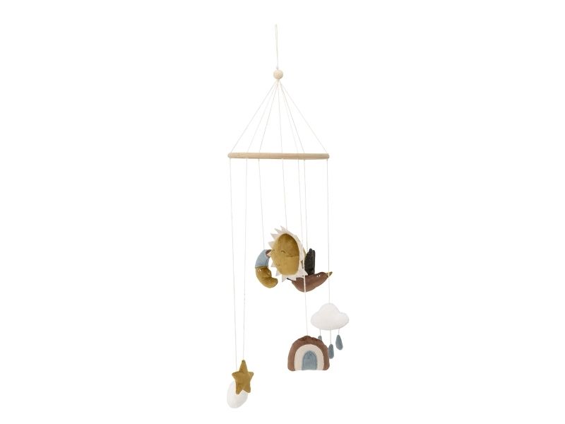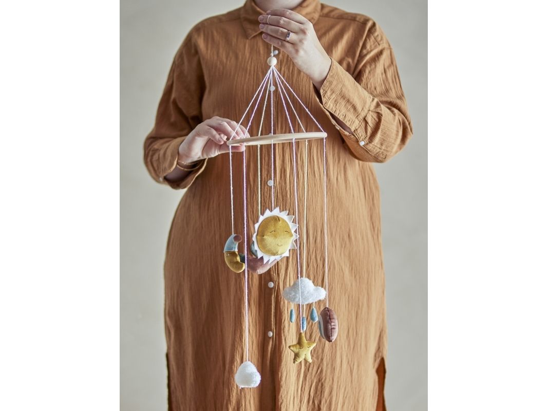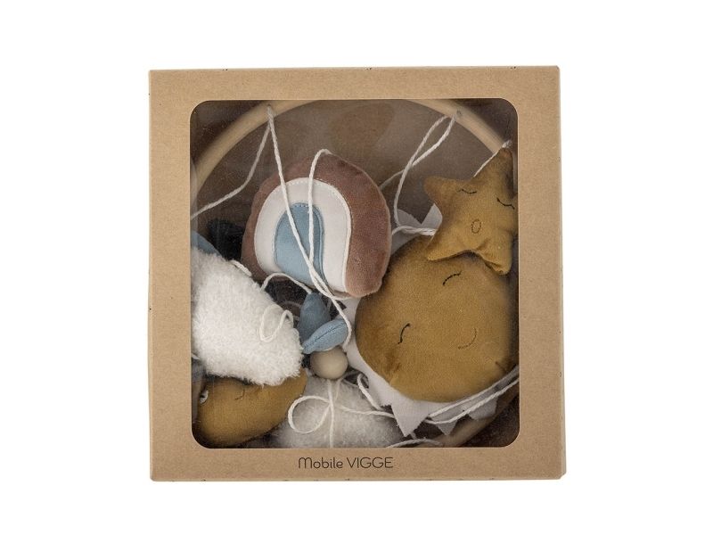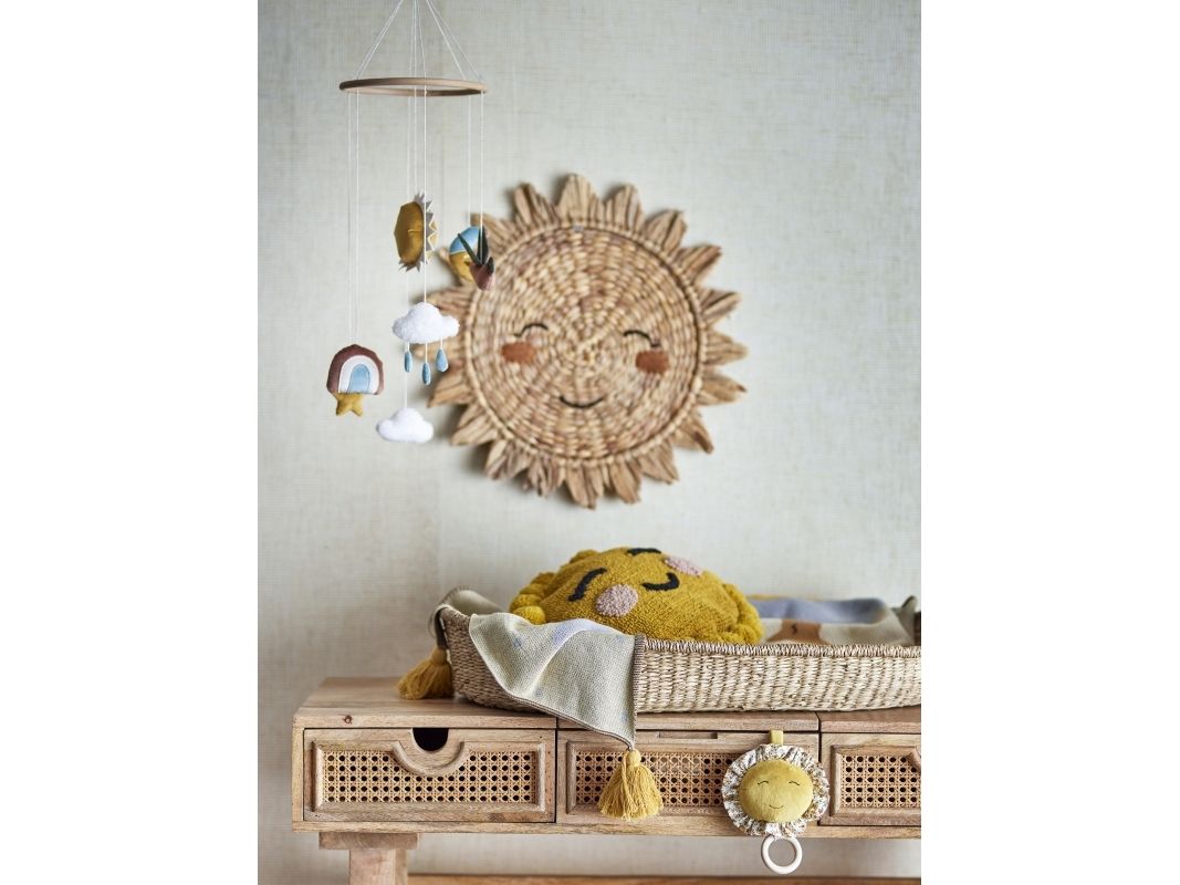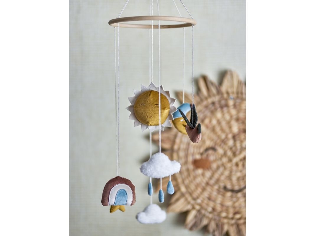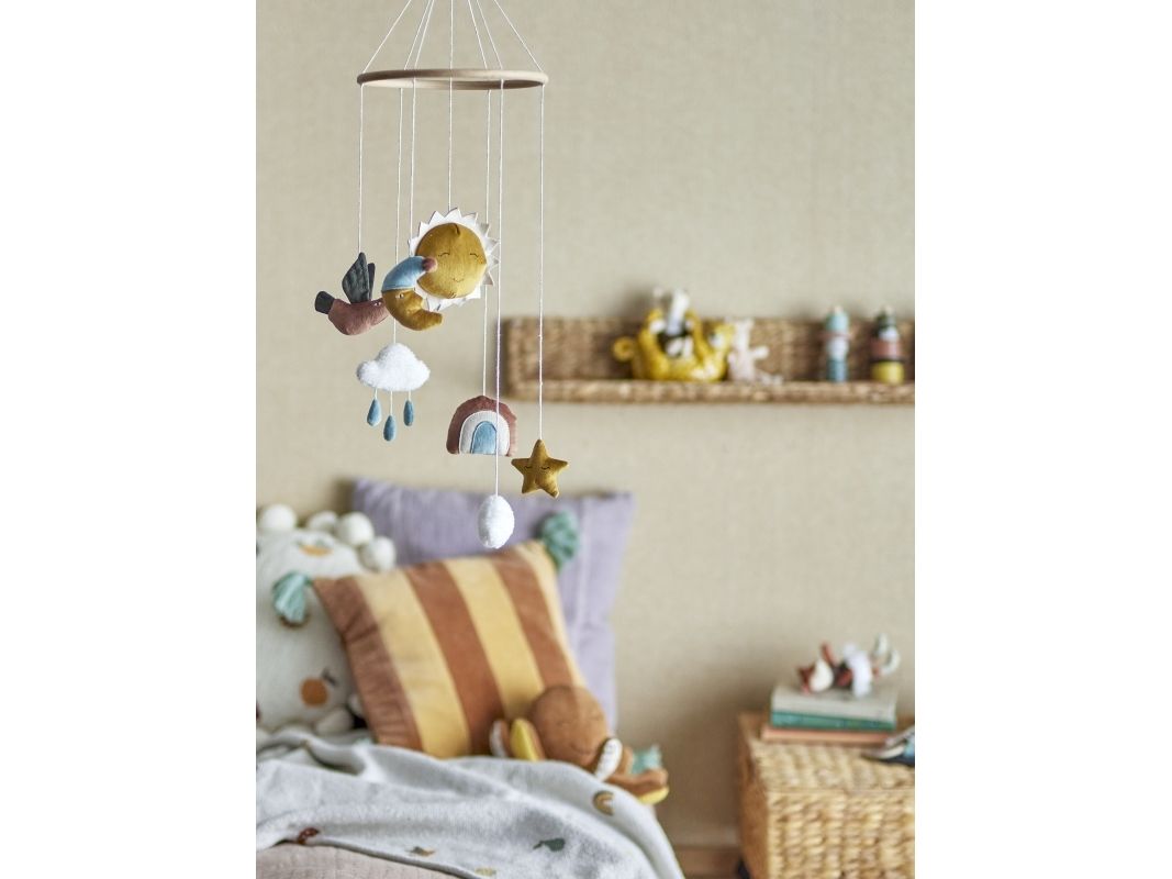 Das hübsche Mobile Vigge von Bloomingville MINI passt perfekt über einem Wickeltisch oder Gitterbett. Die niedlichen Himmelskörper, wie Sonne und Mond, sind aus weichen Materialien gefertigt, wodurch das Mobile besonders gemütlich und dekorativ wirkt.