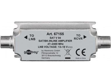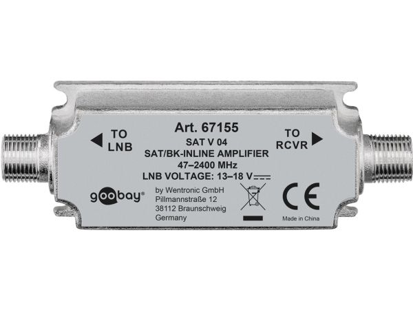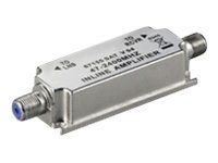 Strecken-Nahverstärker zur Anhebung von Signalen Inlineverstärker für SAT und Terrestrik bei langen Kabelwegen oder größeren Verteilungen Anschluss des Satellitenkabels an den Leistungsverstärker über F-Anschlussbuchsen Receiver wird über das Koaxialkabel verbunden. Spannung: 15 V DC (+/- 3 V) Verstärkung: 20 dB Rauschmaß: max. 4,5 dB