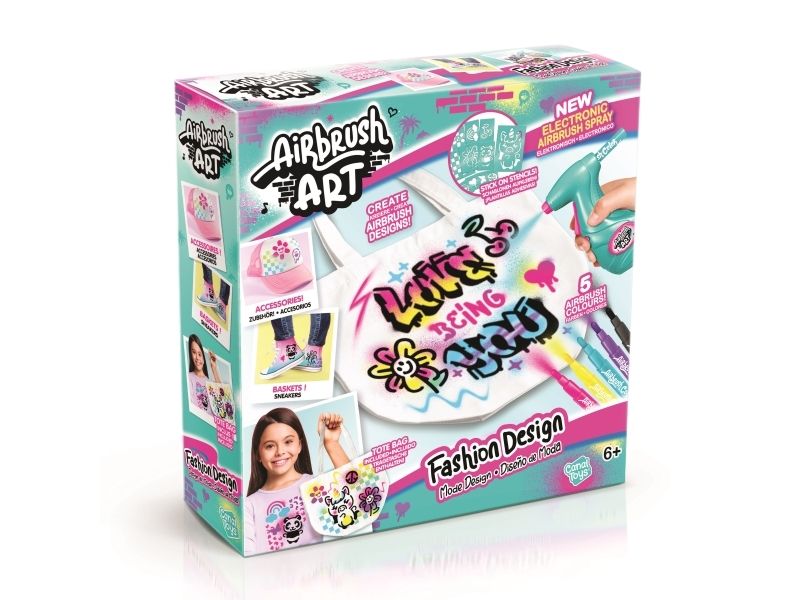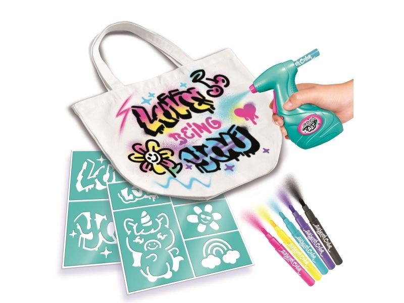 Decorate your clothing and textile accessories with this Airbrush art kit! Insert a marker into the electronic spray and spray on the tote bag included. Create unique graphic effects with the stencils and markers! From 6 years. Includes: - 1 airbrush art spray - 6 markers - 3 stick-on stencil sheets - 1 tote bag - 1 instruction sheet