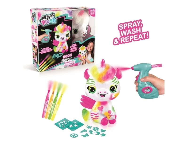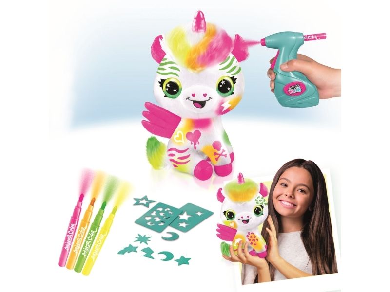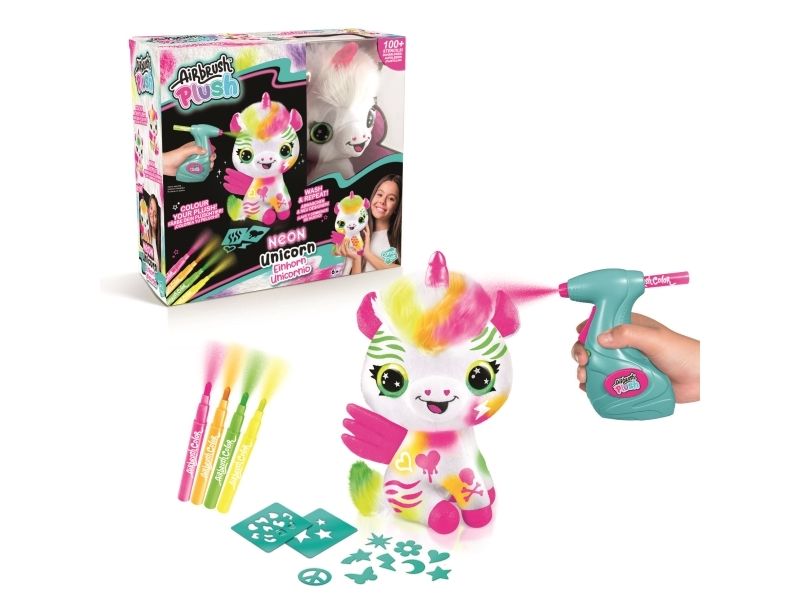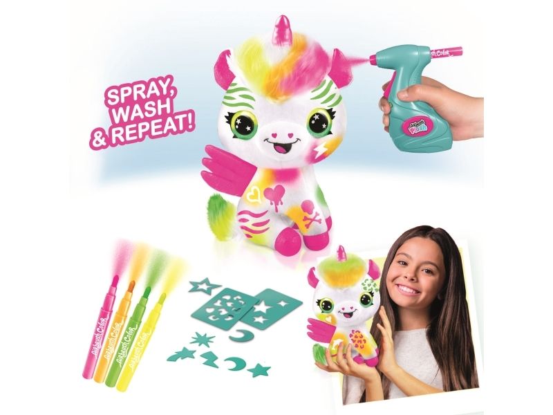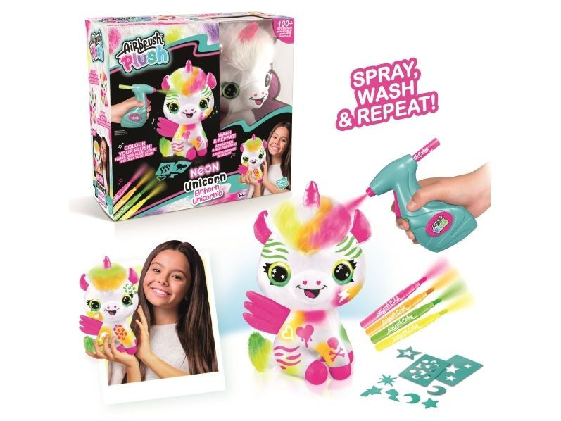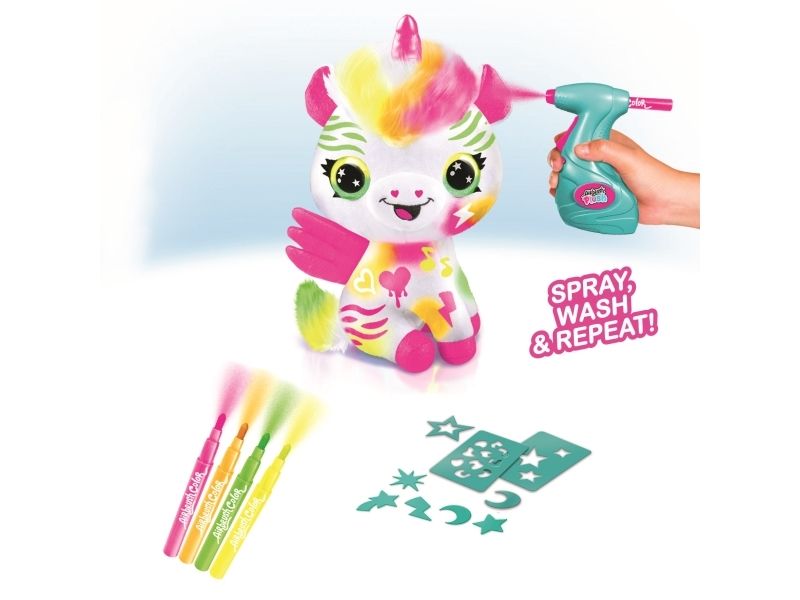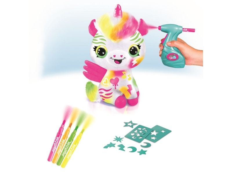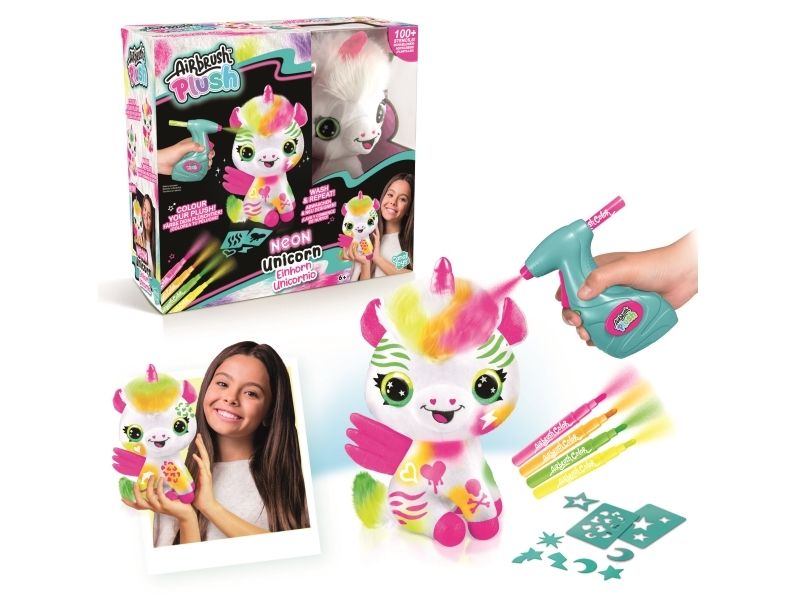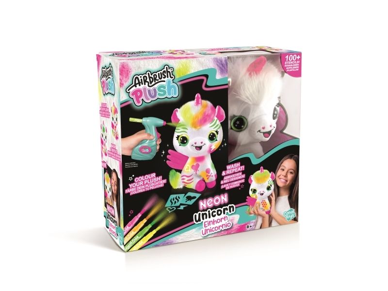 Customize your own adorable plush. Design and create your own multicolored plush with the airbrush and stick-on stencils. The real airbrush gun makes it so easy and satisfying to create trendy and cute multicolored plushies! Use the airbrush gun to apply your favorite colors and create cool, seamless, color-blended effects! This super cute unicorn plush is your blank canvas. Explore your personal style and creativity by customizing over and over again! When you’re ready for a new design, simply wash off the old one and start over! From 6 years. Includes: - 1 unicorn plush - 1 spray pump - 4 neon markers - 1 pair of gloves - 120 reusable stencils - 1 instruction manual