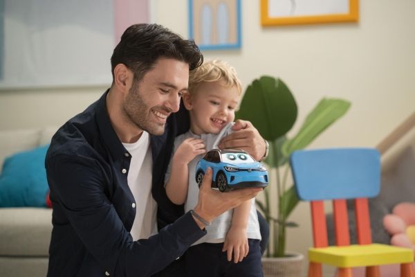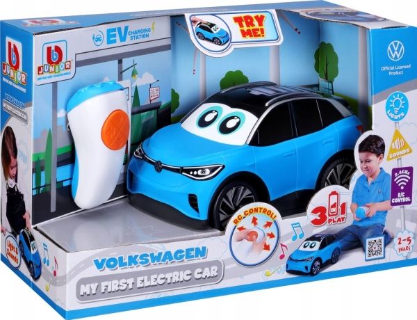 3-in-1 play: full function, light & sound, charge & play. Your child will be thrilled with their very first electric car! "My First Electric Car" is a full function R/C car with lights and sounds. Fun electric car sounds that let you child pretend to charge up the car all while the battery indicator on the roof lights up. Car requires 3 x AA batteries (included) and the remote controller requires 2 x AAA batteries (not included). Length of car 21 cm. From 24 months.
