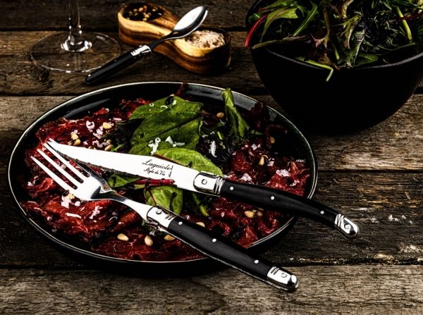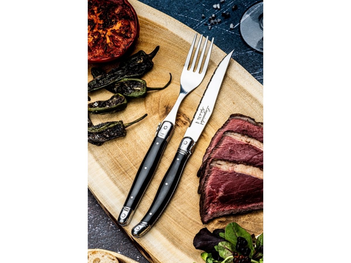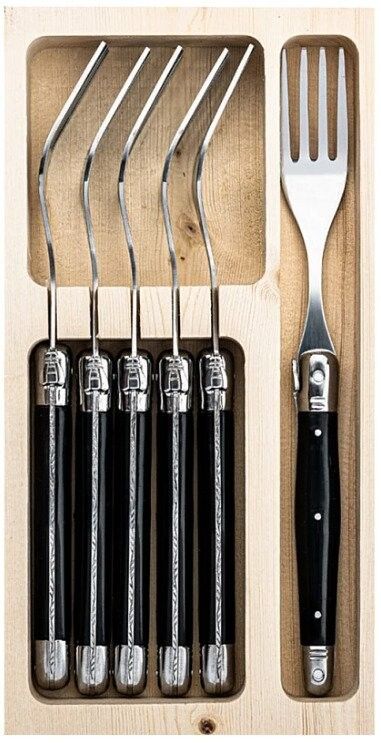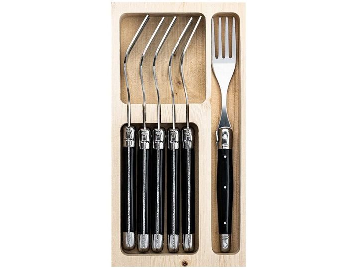With the 6-piece fork set Black from the Premium Line of Laguiole Style de Vie you enjoy every meal to the fullest. The forks are made of Stainless Steel. The thickness of the forks are 1.8mm and are dishwasher safe. Each set comes in a handy wooden block. The 6-piece fork set from the Premium Line is also available in other colours and materials or complete your set with the matching steak knives.