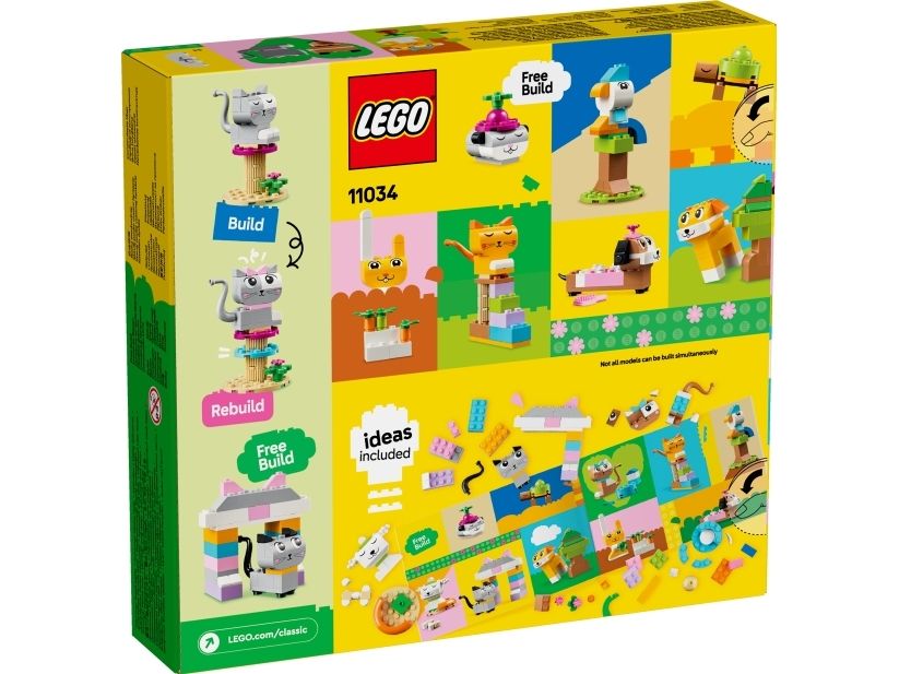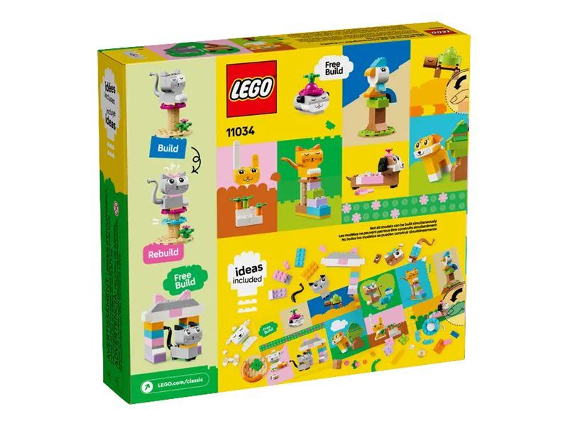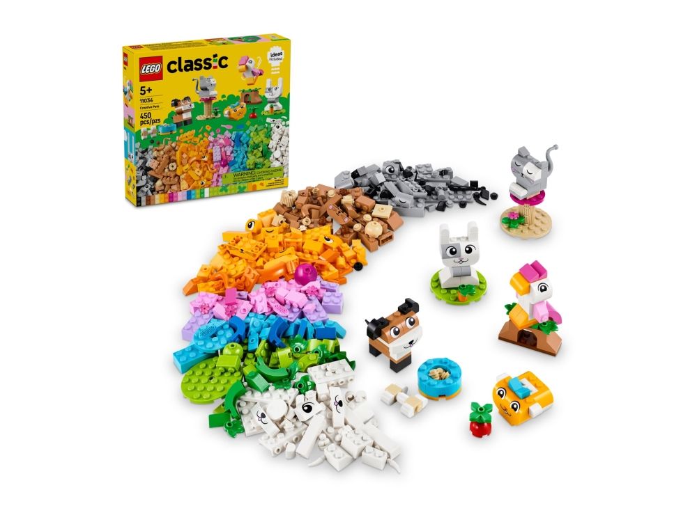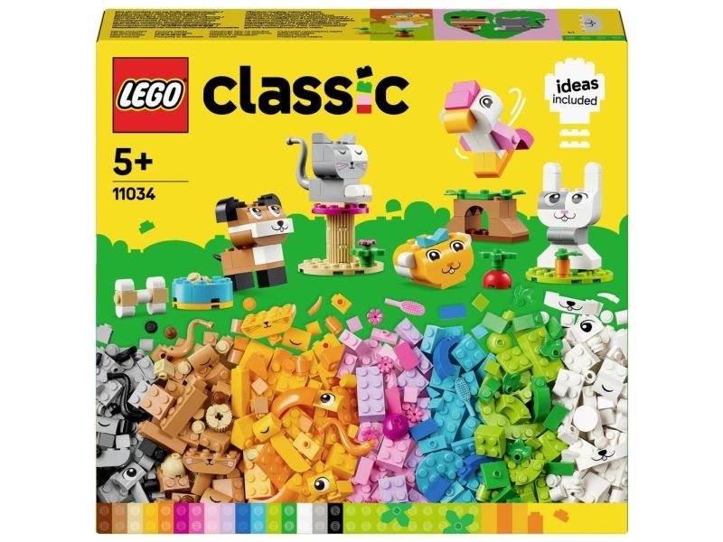 Dieses kreative Bauset lässt Tierfreunde ab 5 Jahren ihre Begeisterung für Tiere ausleben. LEGO® Classic Tiere (11034) ist ein inspirierender Mix aus Tier-Bausteinen. Einfache Bauanleitungen lassen dein Kind die farbenfrohen Tiere rasch zusammenstecken. Außerdem wird dein Kind zu vielen kreativen Modellen inspiriert. 450 LEGO Bausteine, darunter auch spezielle Elemente wie Augen und Münder, sowie einfache Schritt-für-Schritt-Anleitungen lassen Kinder einen Hund mit Fressnapf und Knochen, eine Katze auf ihrem Kratzbaum, einen Hamster mit Apfel, einen Hasen mit Karotte sowie einen Vogel auf einer Stange bauen. Mithilfe der beiliegenden Vorschläge für andere Farben, Formen und Funktionen kann dein Kind seine Tiere dann kreativ umbauen. Je mehr kreative Fähigkeiten dein Kind entwickelt, desto mehr eigene Ideen kann es ausprobieren. Eine Anleitung mit 10 Bauideen liegt bei, um Kinder rasch ganz frei bauen zu lassen. LEGO Classic Spielzeuge strotzen vor inspirierenden Ideen, damit Eltern bei gemeinsamen Bauprojekten wichtige Entwicklungsschritte ihrer Kinder miterleben können.