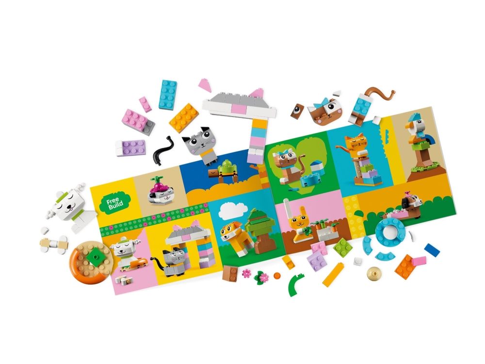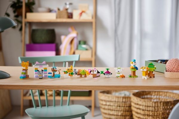 Spielzeugtiere aus LEGO® Steinen: Kinder können eine Katze auf ihrem Kratzbaum, einen Hund mit Fressnapf und Knochen, einen Hamster mit Apfel, einen Hasen mit Karotte und einen Vogel auf seiner Stange bauen