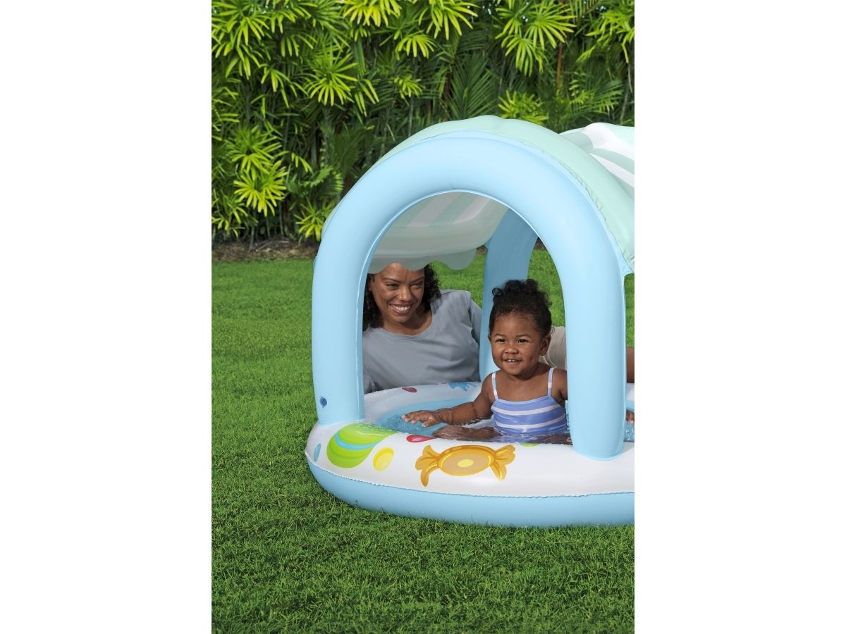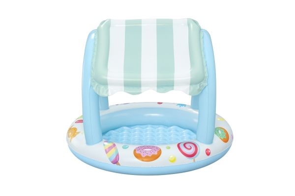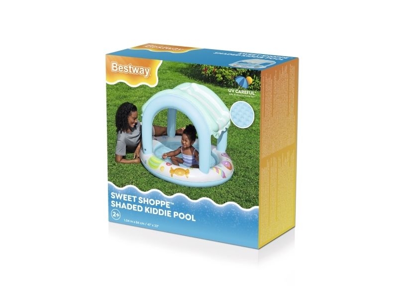 Make some sweet backyard memories with the Bestway Sweet Shoppe™ Shaded Kiddie Pool! Designed for kids ages 2 and up, this kiddie pool has a water capacity of 34 L ( 9 gal.) and features colorful candy graphics guaranteed to delight your little one. The pool also features a UV Careful™ inflatable sunshade that provides safe, shaded fun in the sun while your child splashes and plays as well as a soft, inflatable floor for added comfort. Plus, the compact design makes setup and takedown a breeze. For a summer full of sweetness, look no further than the Bestway Sweet Shoppe Shaded Kiddie Pool!Bestway Sweet Shoppe Inflatable Shaded Kiddie Pool 1.04 m x 84 cm. Product type: Baby bath, Coloration: Pattern, Material: Polyvinyl chloride (PVC). Width: 1040 mm, Depth: 1040 mm, Height: 840 mm. Quantity per pack: 1 pc(s), Package width: 80 mm, Package depth: 240 mm. Packaging content: 1 pool, repair patch. Minimum order quantity: 4 pc(s)