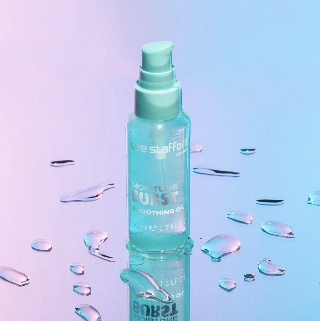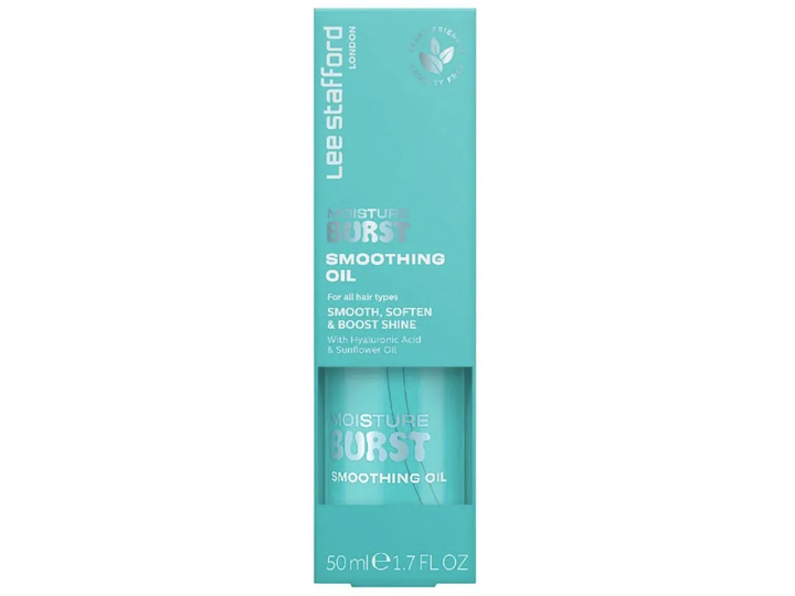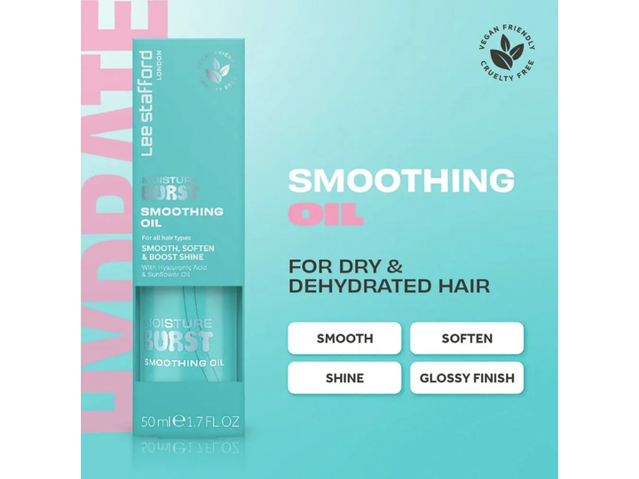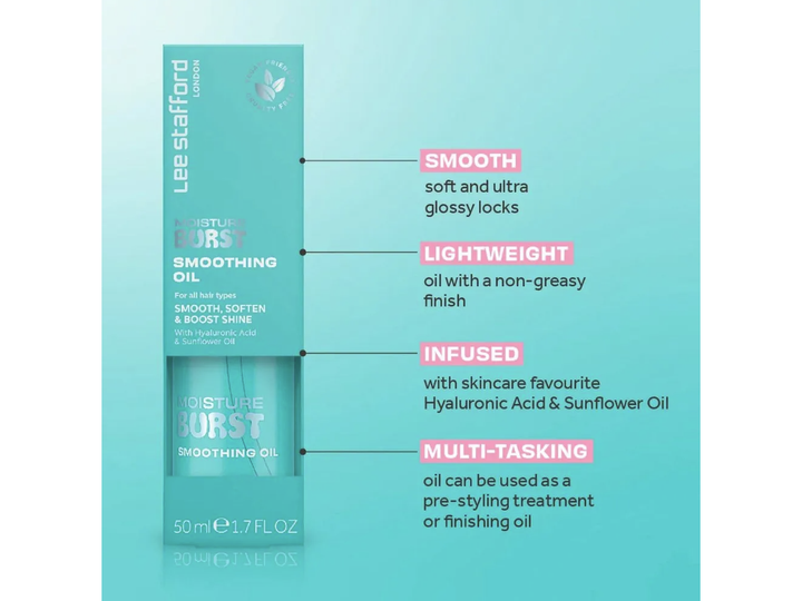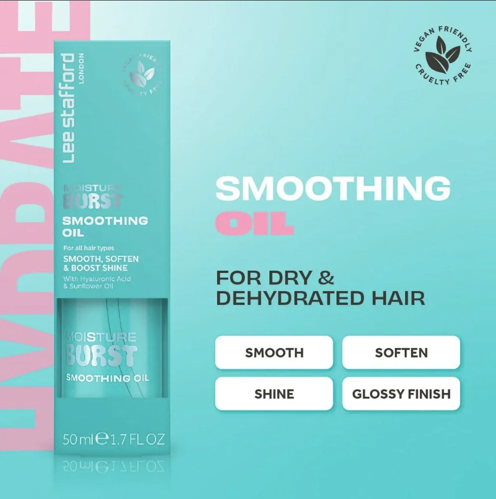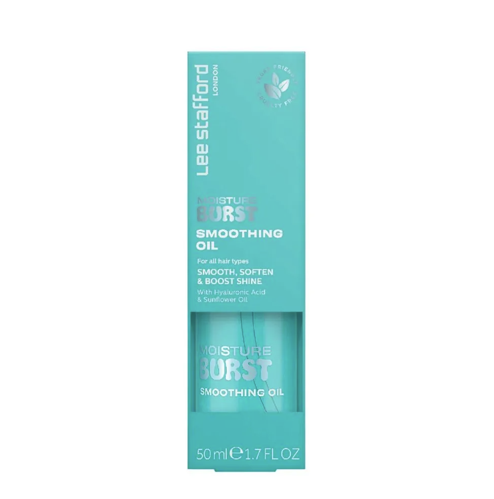 Lee Stafford Moisture Burst Smoothing Oil er en livredder til tørt og dehydreret hår og giver dig glans, glathed og næring i ét! Denne vægtløse og ikke-fedtende olie er perfekt til sprøde tråde med nærende ingredienser, der plejer dit hår uden at tynge det. Med hudplejefavorithyaluronsyre og solsikkeolie kan denne udglattende formel bruges som en pre-styling behandling for at hjælpe med at kontrollere flyvsk hår eller som en afsluttende olie for at give dit hår en strålende, blank glød. Denne unikke olie-serum-hybrid er den ultimative multitasker og kan bruges i vådt eller tørt hår for at få en silkeblød finish hver gang.