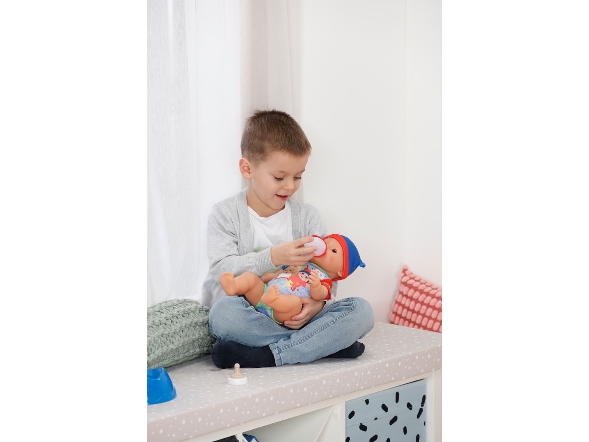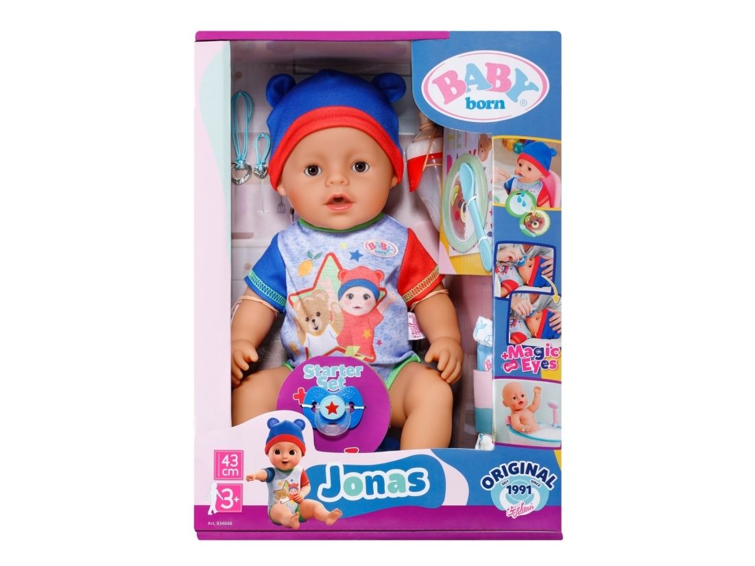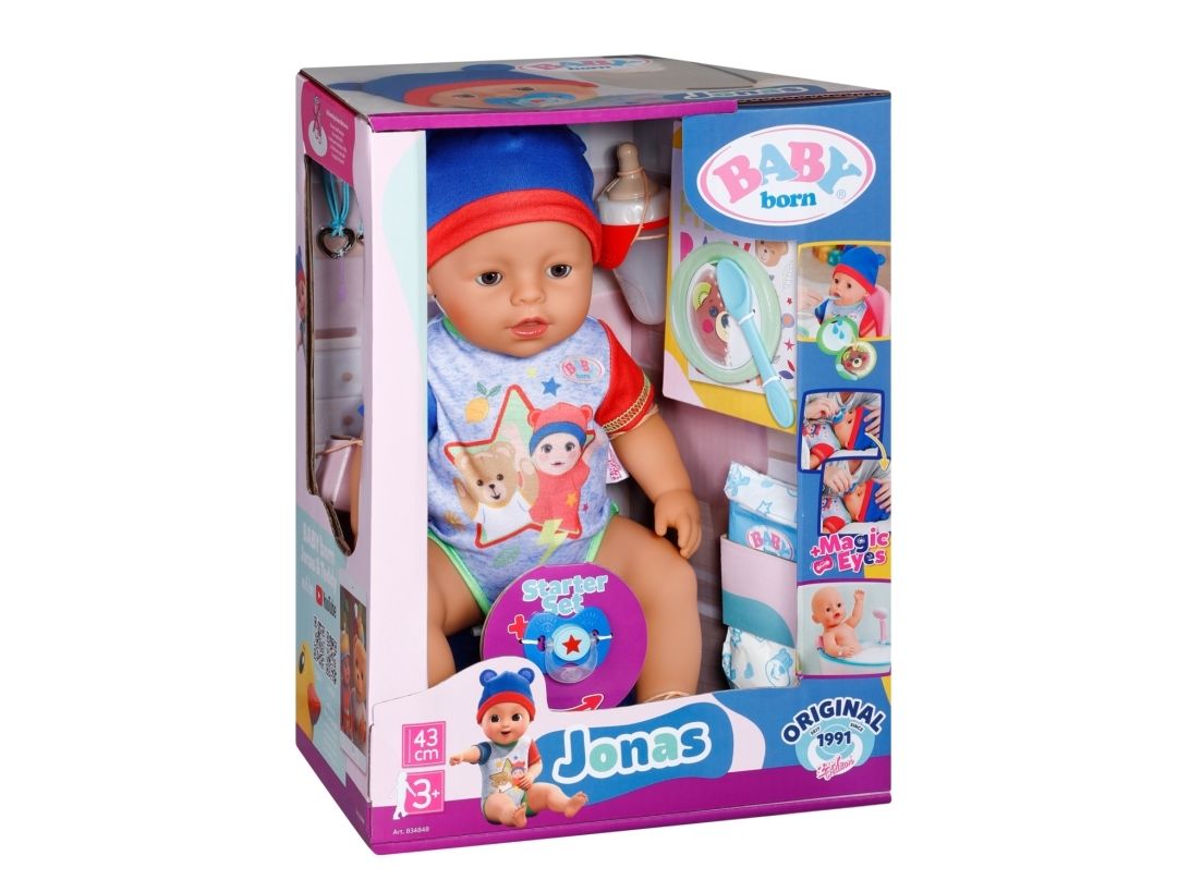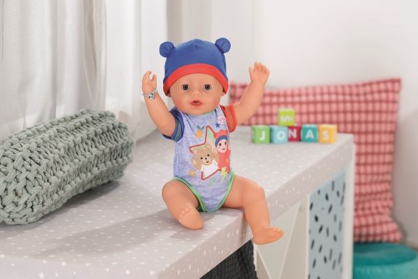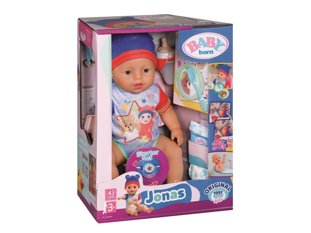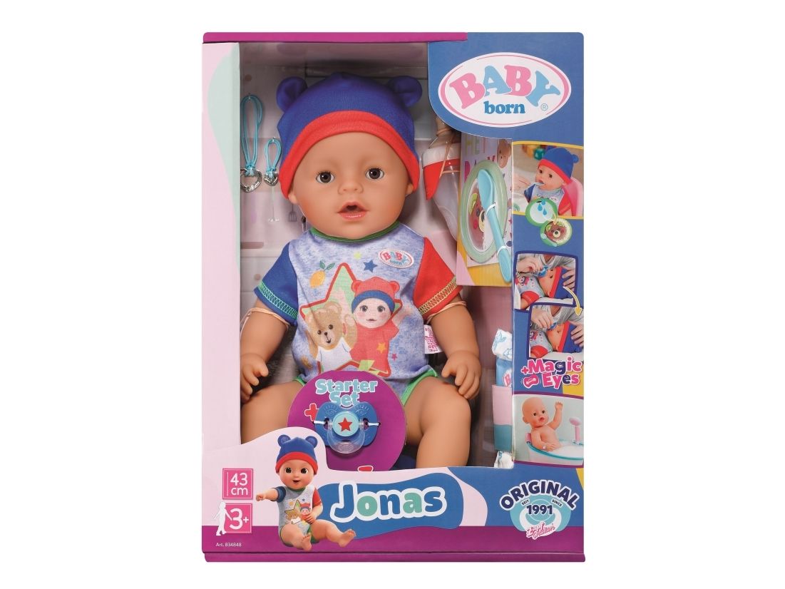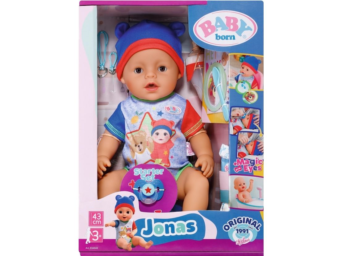 Hier kommt Jonas! Bereits bekannt aus der BABY born Animationsserie, welche auf YouTube und Toggo zu sehen ist, gibt es Jonas jetzt auch in seinem neuen Outfit und mit 10 Accessoires für euch zu Hause. Mit dabei hat er auch seinen magischen Teller: gibt man Wasser auf die Einlege- Fläche im Teller, erscheinen dort durch den Wasserzauber leckere Gerichte, die das Fütterspiel noch spannender machen. Setzt man ihn nach dem gespielten Essen (mit Wasser) oder Trinken auf ihr Töpfchen und drückt ihm auf den Bauch, erscheinen auch dort sein kleines und ihr großes Geschäft. Trinkt Jonas Wasser aus seinem Fläschchen, kann er sogar weinen und muss behutsam getröstet werden. Dabei hilft der magische Schnuller: dreht man ihn um 180 Grad, schließen oder öffnen sich seine Augen. Nochmal gedreht und das Gegenteil passiert. Legt man ihn zum Schlafen ins Bettchen, schließt sie ihre Augen auch ohne Schnuller. Doch Jonas kann noch viel mehr: Er ist super beweglich und kann sogar mit in die Badwanne genommen werden, denn er trocknet jetzt noch schneller: Um die Puppe nach dem Spiel richtig zu reinigen, kann das Bein entfernt werden, um eine größere Öffnung für die Reinigung zu schaffen. Wasser kann so viel einfacher abfließen. Für noch mehr kreatives Spiel bringt Jonas neben seinem Fläschchen, Schnuller, Teller, Löffelchen, Mahlzeiten und Töpfchen auch noch eine Windel, seinem Geburtspass und zwei Freundschaftsarmbändchen mit – für eine lange und liebevolle Freundschaft zwischen Kind und Puppe. In der gewohnten BABY born Qualität, die Generationen von Kindern seit 1991 begeistert. • Kann trinken, schlafen, weinen, baden und in die Windel machen • Durch den Fütterzauber erscheint sein Lieblingsessen bei Wasserkontakt im Tellerchen • Auch das große und kleine Geschäft erscheinen auf magische Weise im Töpfchen • Schließt und öffnet die Augen mit Schnuller-Drehung • Mit 10 Accessoires
