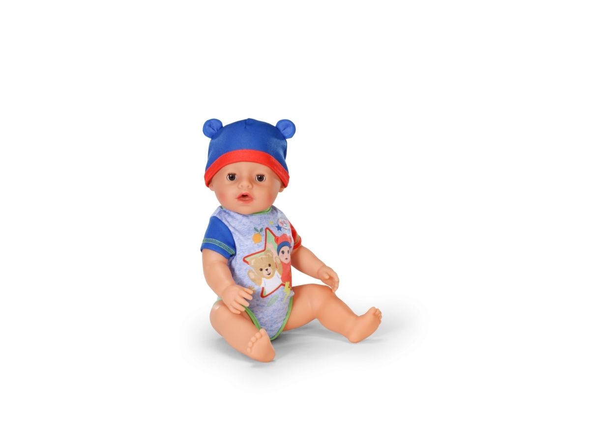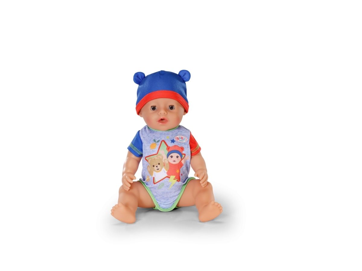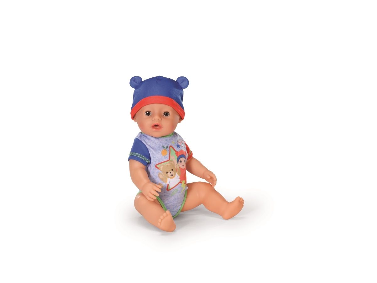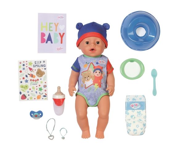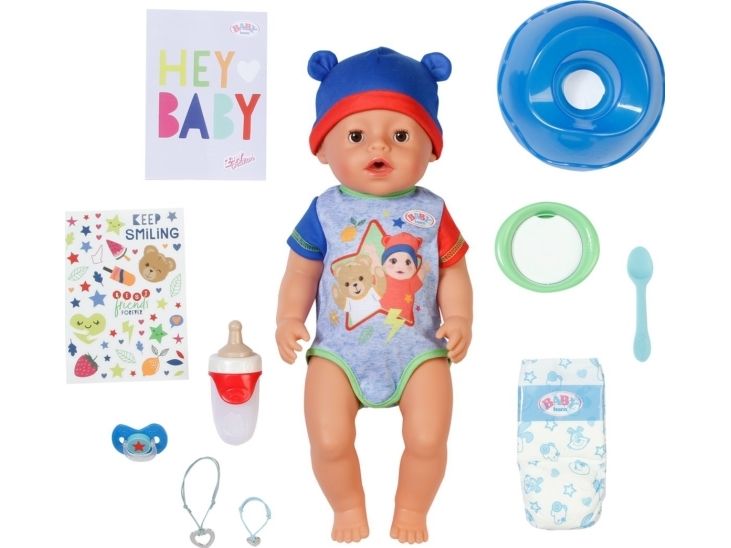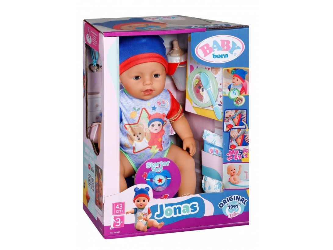 Hier kommt Jonas! Bereits bekannt aus der BABY born Animationsserie, welche auf YouTube und Toggo zu sehen ist, gibt es Jonas jetzt auch in seinem neuen Outfit und mit 10 Accessoires für euch zu Hause. Mit dabei hat er auch seinen magischen Teller: gibt man Wasser auf die Einlege- Fläche im Teller, erscheinen dort durch den Wasserzauber leckere Gerichte, die das Fütterspiel noch spannender machen. Setzt man ihn nach dem gespielten Essen (mit Wasser) oder Trinken auf ihr Töpfchen und drückt ihm auf den Bauch, erscheinen auch dort sein kleines und ihr großes Geschäft. Trinkt Jonas Wasser aus seinem Fläschchen, kann er sogar weinen und muss behutsam getröstet werden. Dabei hilft der magische Schnuller: dreht man ihn um 180 Grad, schließen oder öffnen sich seine Augen. Nochmal gedreht und das Gegenteil passiert. Legt man ihn zum Schlafen ins Bettchen, schließt sie ihre Augen auch ohne Schnuller. Doch Jonas kann noch viel mehr: Er ist super beweglich und kann sogar mit in die Badwanne genommen werden, denn er trocknet jetzt noch schneller: Um die Puppe nach dem Spiel richtig zu reinigen, kann das Bein entfernt werden, um eine größere Öffnung für die Reinigung zu schaffen. Wasser kann so viel einfacher abfließen. Für noch mehr kreatives Spiel bringt Jonas neben seinem Fläschchen, Schnuller, Teller, Löffelchen, Mahlzeiten und Töpfchen auch noch eine Windel, seinem Geburtspass und zwei Freundschaftsarmbändchen mit – für eine lange und liebevolle Freundschaft zwischen Kind und Puppe. In der gewohnten BABY born Qualität, die Generationen von Kindern seit 1991 begeistert. • Kann trinken, schlafen, weinen, baden und in die Windel machen • Durch den Fütterzauber erscheint sein Lieblingsessen bei Wasserkontakt im Tellerchen • Auch das große und kleine Geschäft erscheinen auf magische Weise im Töpfchen • Schließt und öffnet die Augen mit Schnuller-Drehung • Mit 10 Accessoires