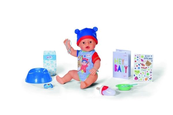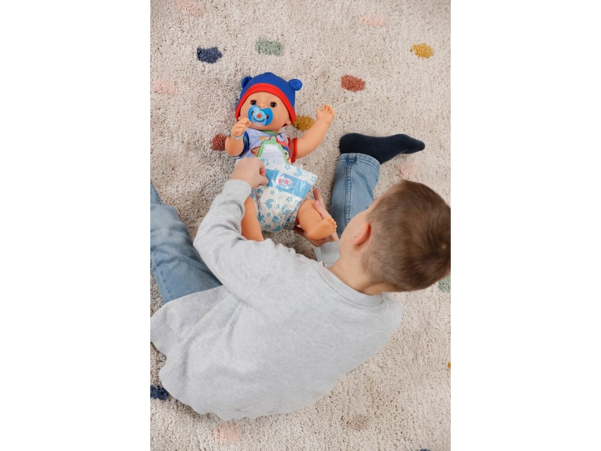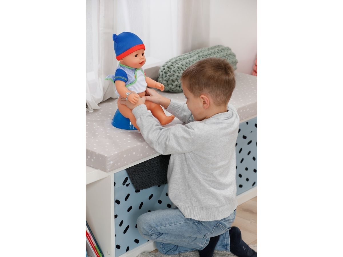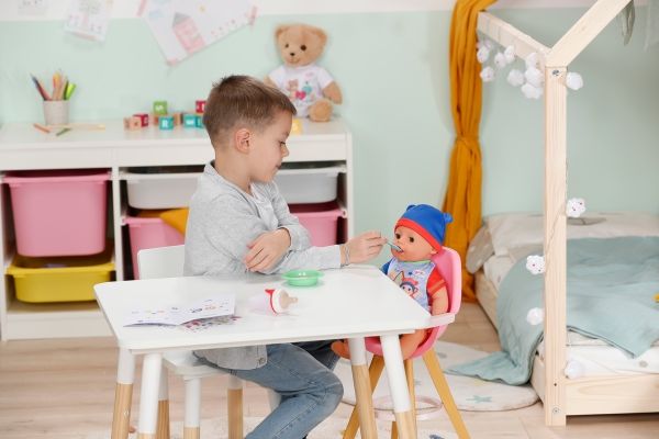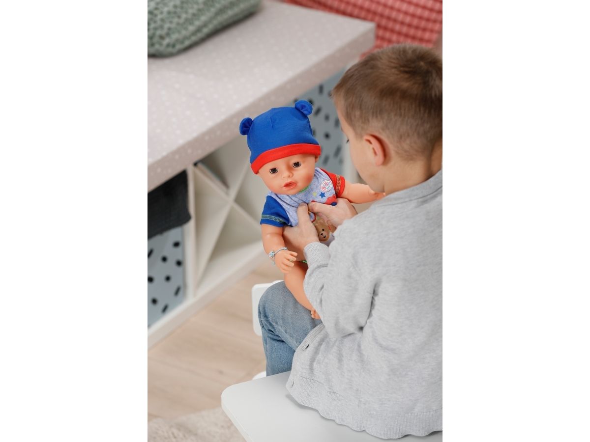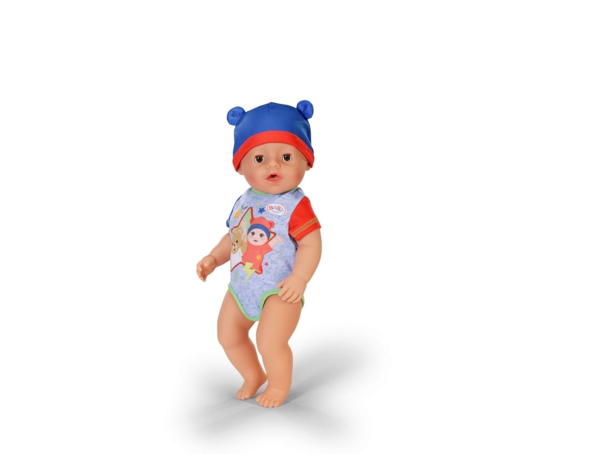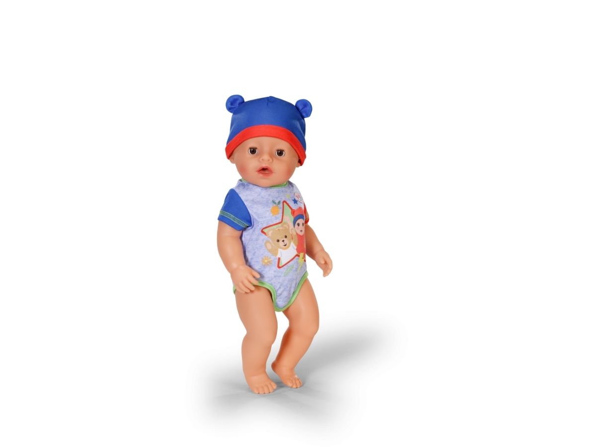 Hier kommt Jonas! Bereits bekannt aus der BABY born Animationsserie, welche auf YouTube und Toggo zu sehen ist, gibt es Jonas jetzt auch in seinem neuen Outfit und mit 10 Accessoires für euch zu Hause. Mit dabei hat er auch seinen magischen Teller: gibt man Wasser auf die Einlege- Fläche im Teller, erscheinen dort durch den Wasserzauber leckere Gerichte, die das Fütterspiel noch spannender machen. Setzt man ihn nach dem gespielten Essen (mit Wasser) oder Trinken auf ihr Töpfchen und drückt ihm auf den Bauch, erscheinen auch dort sein kleines und ihr großes Geschäft. Trinkt Jonas Wasser aus seinem Fläschchen, kann er sogar weinen und muss behutsam getröstet werden. Dabei hilft der magische Schnuller: dreht man ihn um 180 Grad, schließen oder öffnen sich seine Augen. Nochmal gedreht und das Gegenteil passiert. Legt man ihn zum Schlafen ins Bettchen, schließt sie ihre Augen auch ohne Schnuller. Doch Jonas kann noch viel mehr: Er ist super beweglich und kann sogar mit in die Badwanne genommen werden, denn er trocknet jetzt noch schneller: Um die Puppe nach dem Spiel richtig zu reinigen, kann das Bein entfernt werden, um eine größere Öffnung für die Reinigung zu schaffen. Wasser kann so viel einfacher abfließen. Für noch mehr kreatives Spiel bringt Jonas neben seinem Fläschchen, Schnuller, Teller, Löffelchen, Mahlzeiten und Töpfchen auch noch eine Windel, seinem Geburtspass und zwei Freundschaftsarmbändchen mit – für eine lange und liebevolle Freundschaft zwischen Kind und Puppe. In der gewohnten BABY born Qualität, die Generationen von Kindern seit 1991 begeistert. • Kann trinken, schlafen, weinen, baden und in die Windel machen • Durch den Fütterzauber erscheint sein Lieblingsessen bei Wasserkontakt im Tellerchen • Auch das große und kleine Geschäft erscheinen auf magische Weise im Töpfchen • Schließt und öffnet die Augen mit Schnuller-Drehung • Mit 10 Accessoires
