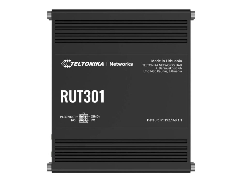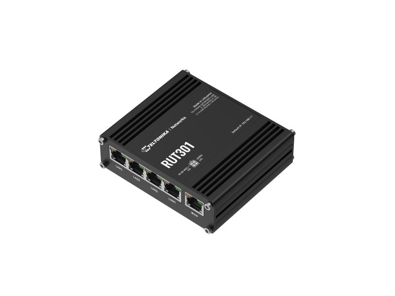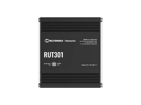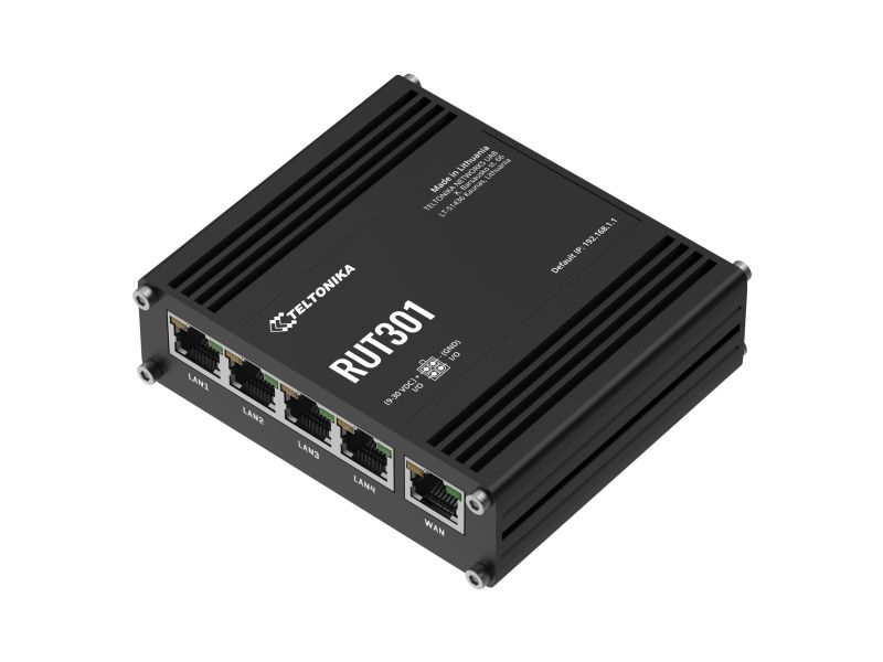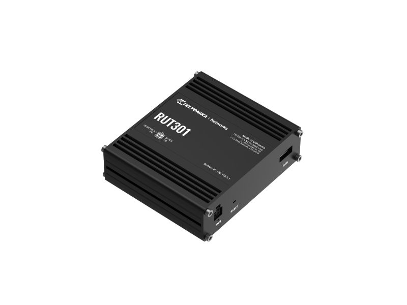 The RUT301 is one of the most cost-efficient industrial Ethernet routers in the IoT market, providing robust network connectivity with advanced security features. This Ethernet router comes with five Ethernet ports, two configurable digital I/Os, and a USB 2.0 port for easy compliance with industrial machinery, enterprise, or retail equipment. Additionally, the RUT301 has a pre-configured firewall and supports multiple industrial communication protocols. Teltonika RUT301 (EU) ethernet router. Device type: Cellular network router, Product colour: Black, Housing material: Aluminium. Ethernet LAN interface type: Fast Ethernet, Ethernet LAN data rates: 10,100 Mbit/s, Networking standards: IEEE 802.11e, IEEE 802.3, IEEE 802.3az, IEEE 802.3u. USB port type: USB Type-A. Processor manufacturer: Mediatek, Processor frequency: 0.58 GHz, RAM capacity: 0.128 GB. Management platform: RMS