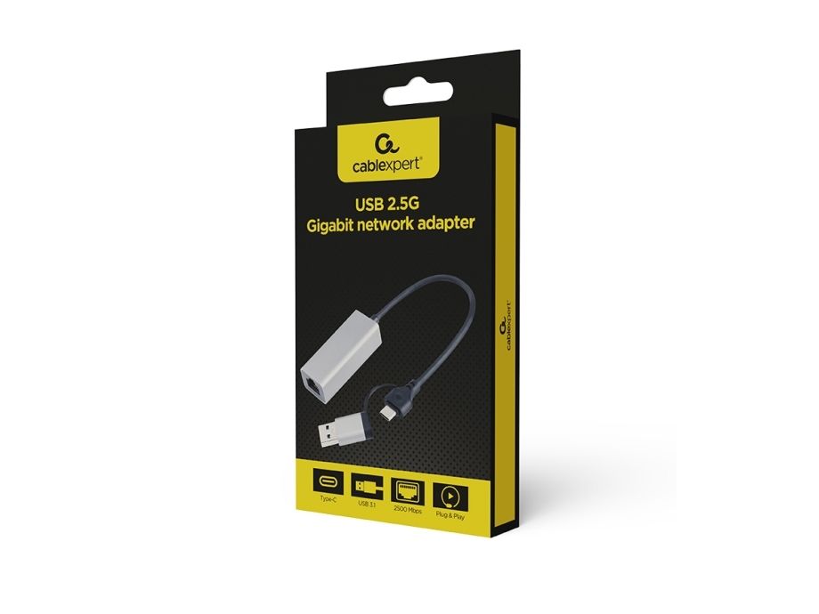 The Gembird Cablexpert A-USB3AC-LAN2G-01 is an efficient network adapter designed to enhance your connectivity experience. This USB 3.1 Gen 1 adapter provides a wired connection with data transfer rates up to 2500 Mbps, ensuring speedy and reliable networking. With a compact length of 15 cm, the adapter is easily portable and perfect for various setups, whether at home or on-the-go. Compliant with Plug-and-Play standards and multiple regulations such as ISO 9002 and RoHS, this external adapter is simple to use and eco-friendly. The RJ-45 connector enables compatibility with Ethernet types including 10/100/1000/2500Base-T, allowing for versatile networking options. Housed in a durable metal casing, this adapter combines performance with robust design to meet your connectivity needs.