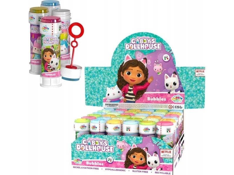 Blowing soap bubbles is a fun summer activity. Gabby’s dollhouse-themed bottle contains 60 ml of bubble liquid. 3+