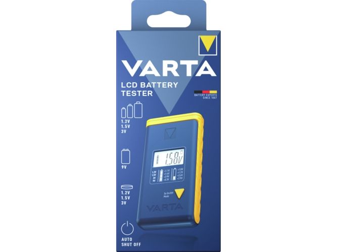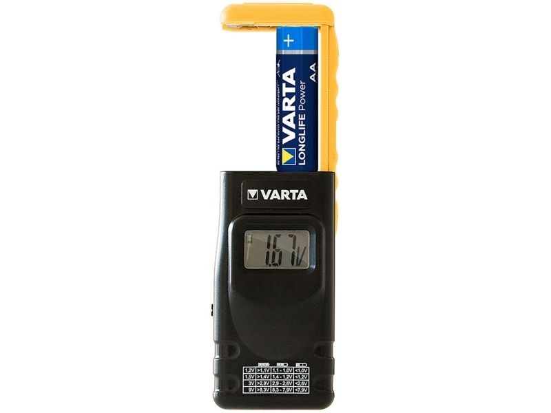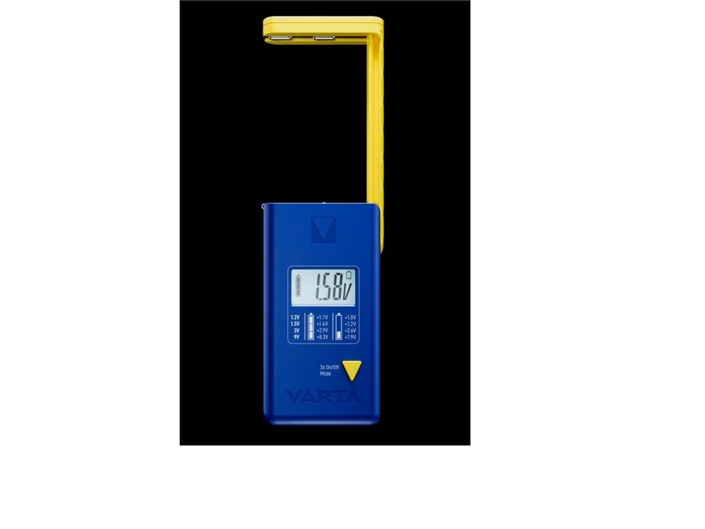digitales Batterieprüfgerät für Batterien, Akkus und Knopfzellen Einfach zu bedienender, präziser Universal-Batterietester von VARTA mit gut lesbarem LC-Display Kompatibel mit den Formaten AAA (Micro), AA (Mignon), C (Baby) und D (Mono) mit 1,2 V und 1,5 V sowie 9-V-Block (NiMH, Alkaline) und Knopfzellen mit 1,2 V, 1,5 V oder 3,0 V Bedruckt mit einer praktischen Spannungstabelle, die den Ladestatus des eingelegten Batterietyps aufschlüsselt Durch den Klemm-Mechanismus an der Oberseite lassen sich alle kompatiblen Batteriegrößen einfach in das Batterietestgerät einsetzen Ausgestattet mit einem Schiebeschalter für sicheres Ein- und Ausschalten Inkl. 2x LR44-Knopfzellen für den Betrieb des Batterieprüfers Maße: 4,3 x 1,9 x 8,8 cm