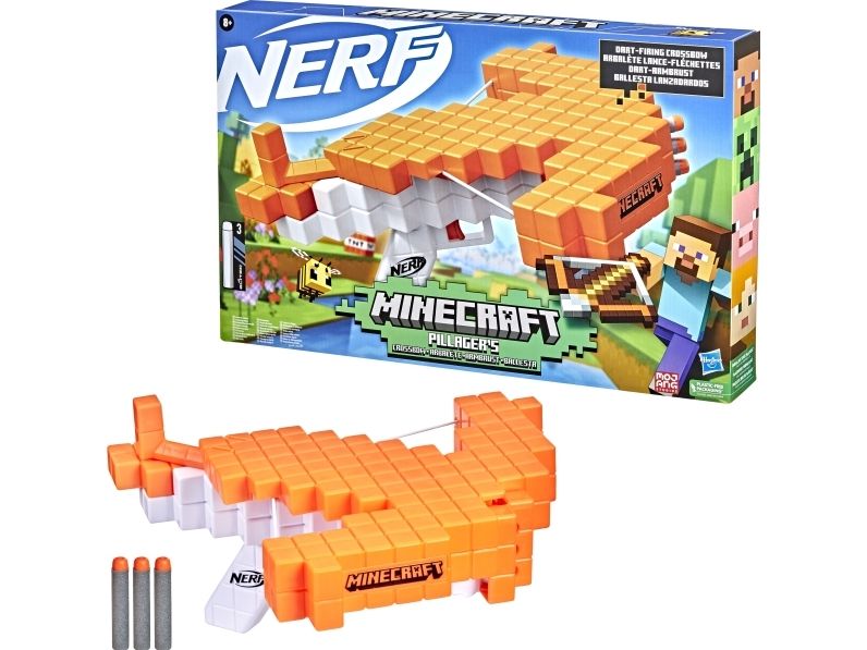 Nerf und Minecraft können kombiniert werden, um spezielle Blaster für Nerf Wettbewerbe zu bauen. Die Nerf Minecraft Pillager's Armbrust ist an das beliebte Spiel, Minecraft, angelehnt. Mit dieser Darts abfeuernden Armbrust lassen sich die Ziele ins Visier nehmen und die Spieler können sich in die spannende Armbrust-Action stürzen. Zum Spannen der Sehne der Armbrust wird der Spannschlitten zurückgezogen. Anschließend wird der Knopf gedrückt, um einen Dart zu starten. Die Armbrust hat 3 Läufe, die von vorne geladen werden, um 3 Darts nacheinander abzuschießen. Die Nerf Minecraft Armbrust enthält 3 auf Leistung und Qualität getestete Nerf Elite Schaumstoff-Darts für Indoor und Outdoor Nerf Spiele. Eine Brille wird empfohlen (nicht enthalten). Copyright 2022 Mojang AB. TM Microsoft Corporation. Hasbro and all related terms are trademarks of Hasbro.