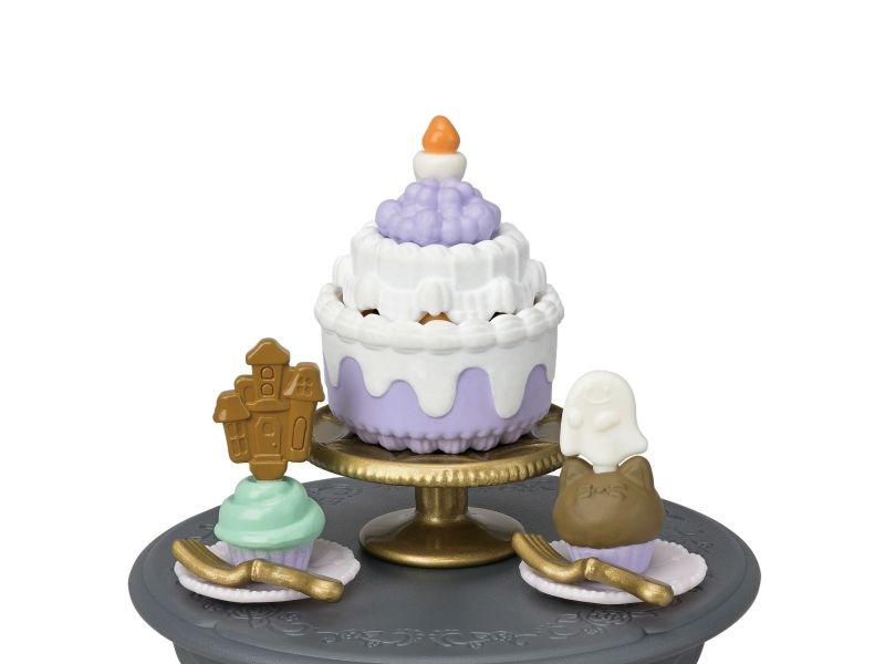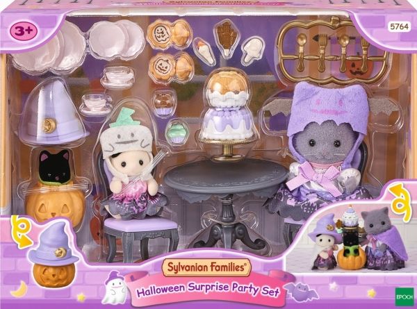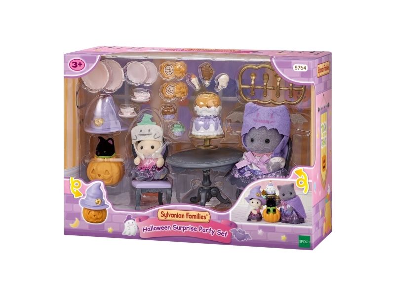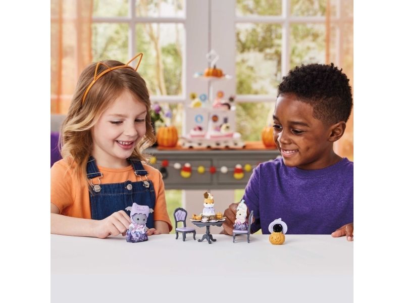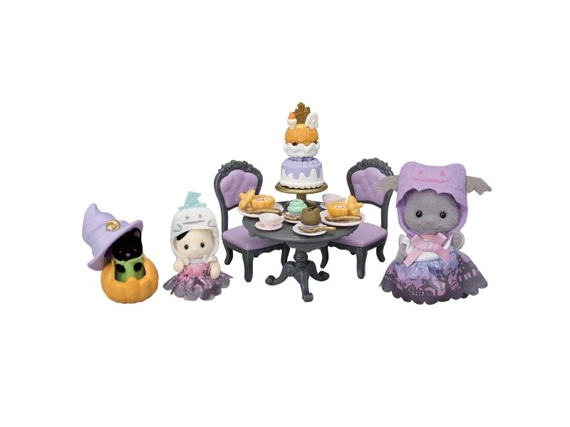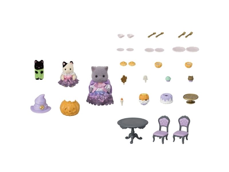 This set contains 3 figures dressed up in Halloween costumes, furniture and a Halloween snack. The baby Magician Cat is hiding in the pumpkin lantern. The Persian Cat girl and the Tuxedo Cat baby are dressed up as ghosts. The Persian Cat girl, the Tuxedo Cat baby, the Midnight Cat baby, 2 chairs, a table, hats, a pumpkin, pastries, cakes and Halloween sweets.
